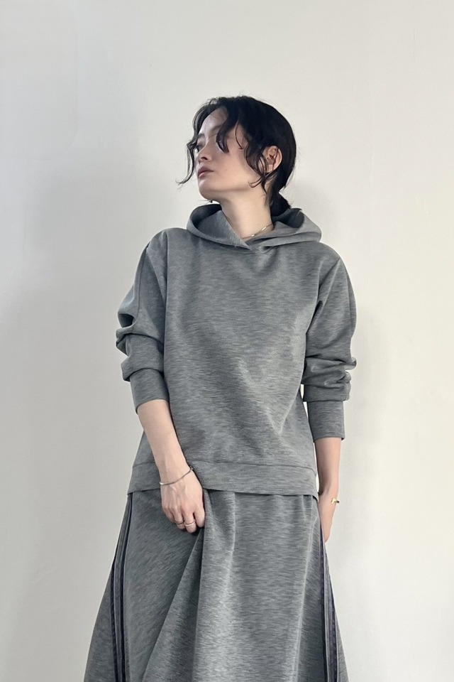 【COMMENT】 きれいな表面感とストレッチ性の高いダンボール素材を使用したフーディーです。あえてディテールをそぎ落とし、着回しやすさを重視しました。比較的コンパクトなサイズ感なので、アウターを選ばず着用していただけます。 ------------------------------------------------ 【MATERIAL】 (本体)レーヨン70% ポリエステル24% ポリウレタン6% ------------------------------------------------ 【SIZE】 着丈:60cm バスト:103.5cm 裄丈:78cm 着用モデル col.A,B:162cm/col.C,D:153cm 生地の厚さ/中厚 裏地/無し ポケット/無し 光沢/無し 透け感/無し 伸縮性/有り 洗濯お手入れ/可能(手洗い洗濯) *商品について 画像の商品はサンプル品にて撮影を行っております。実際の商品と仕様・加工・サイズが若干異なる場合がございます。予めご了承下さい。 *カラーについて お使いのデバイスの設定、撮影時のライティング、商品をご覧になっている際の照明等閲覧環境により実際の色味と異なって見える場合がございます。 *商品の包装について 細心の注意を払って包装しておりますが、通販の特性上、商品到着時に畳みシワがついている場合がございます。予めご了承下さい。 ------------------------------------------------