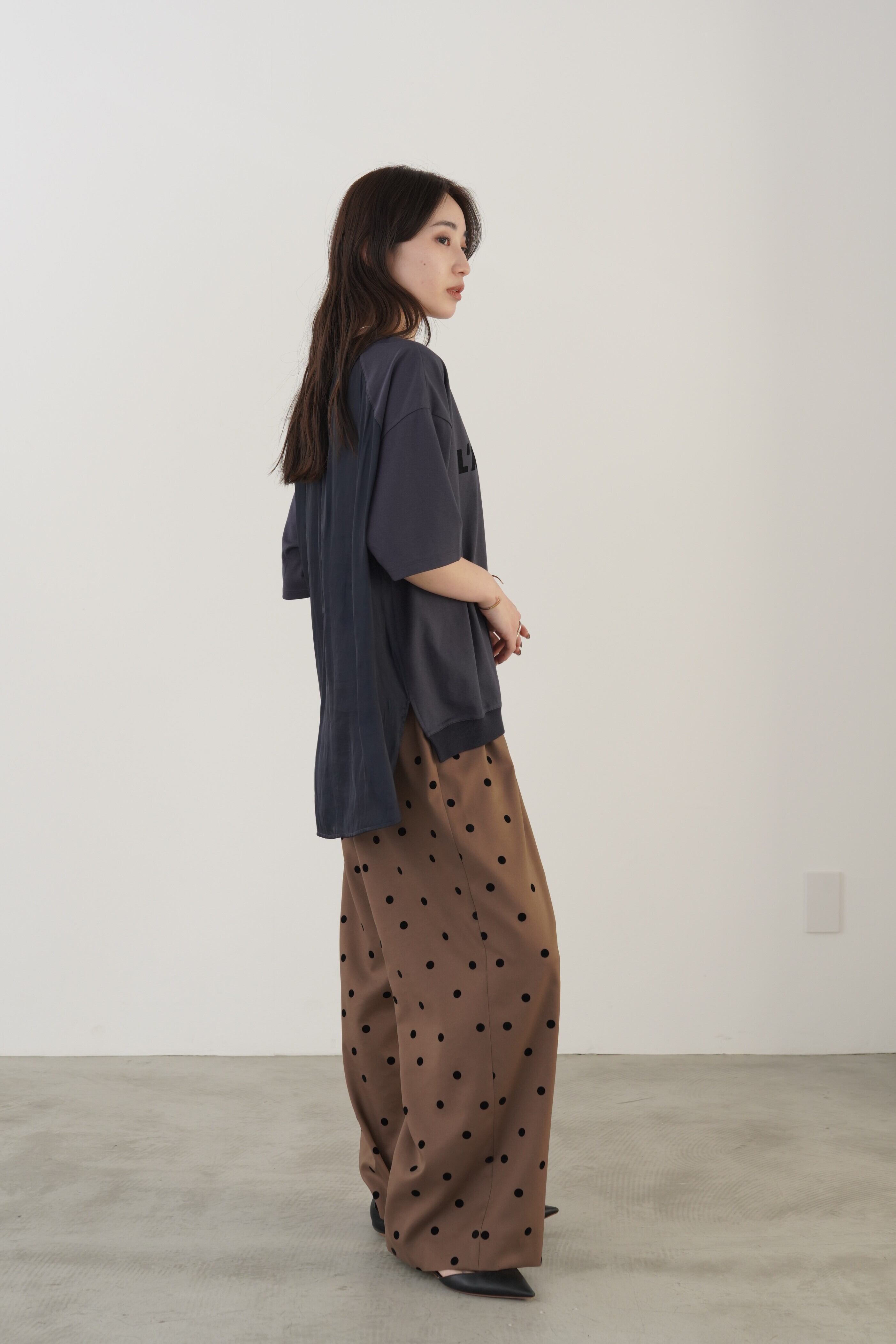 バックスタイルを割繊サテンで切り替え、シャツテールに仕上げたトップス。前身は透けづらく毛羽の少ない、きれいな表面感のカットソーを使用。カジュアルに偏りがちなシーズンにぴったりのきれいめTシャツです。