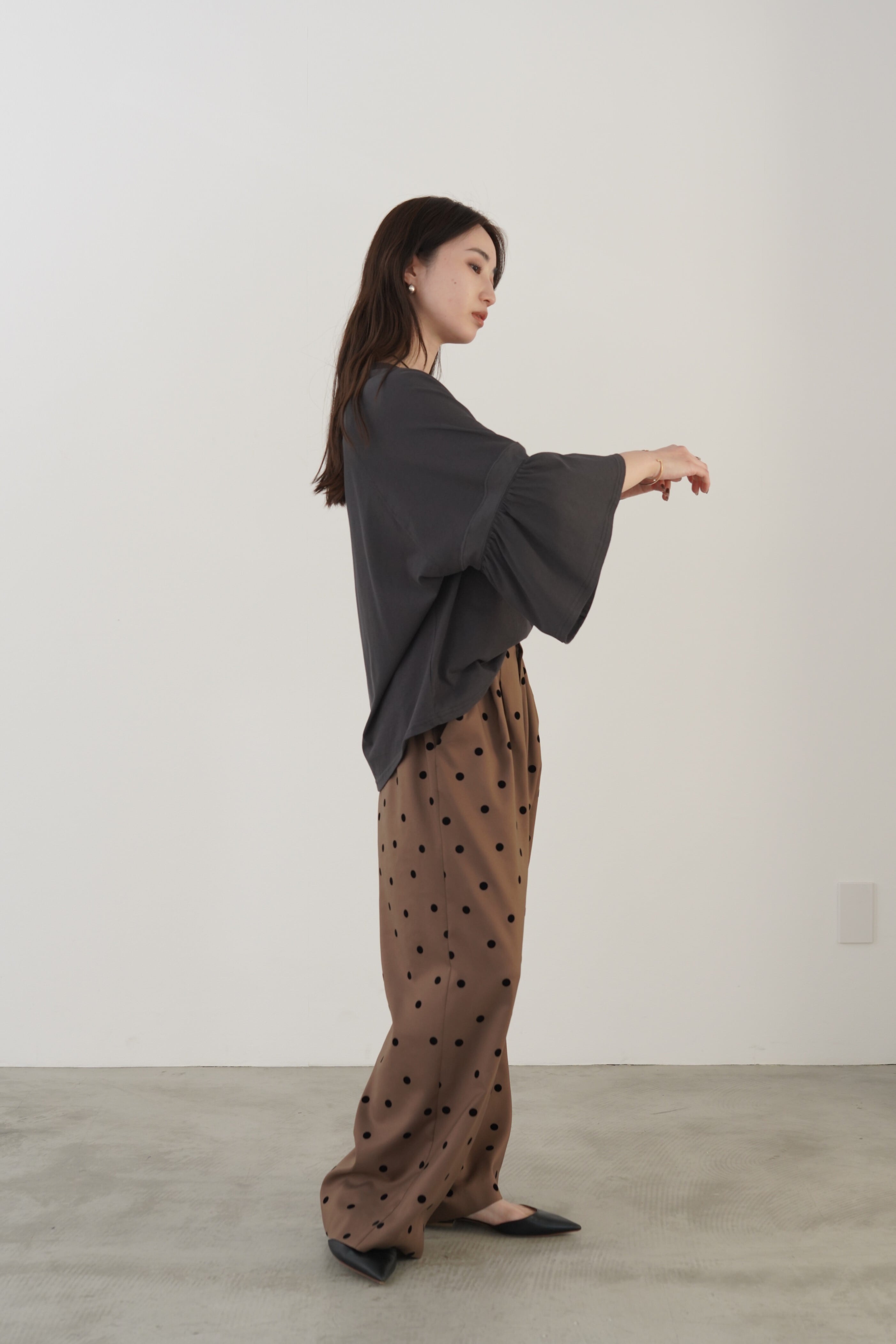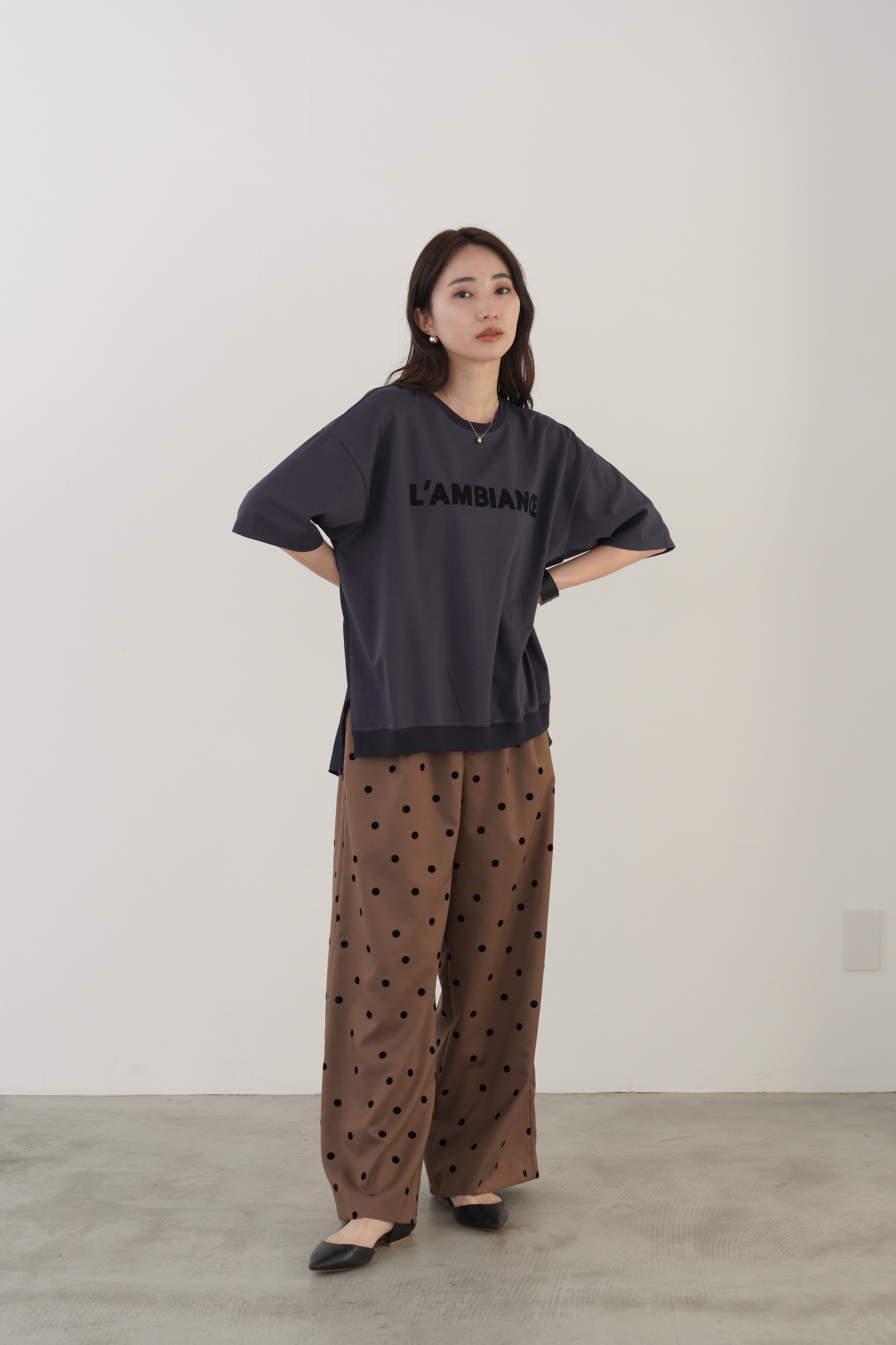 ツイルにプリントされたフロッキードットが目を惹く、ストレートシルエットのパンツ。柔らかく中肉のツイル素材はシワになりづらく、シーズンレスに履き回せる素材感。前身はタックですっきり、後身はゴム仕様のウエストに仕上げました。