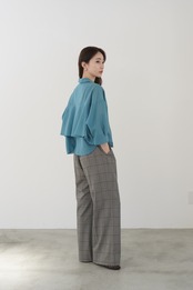 アイコンディテールのバックティアードシャツ。前立て横にはタックを施し、前後に立体感のある仕様。天然繊維の様なルックスの軽いポリエステルを使用しており、ティアードデザインながら後身がシワになりづらいのもポイント。