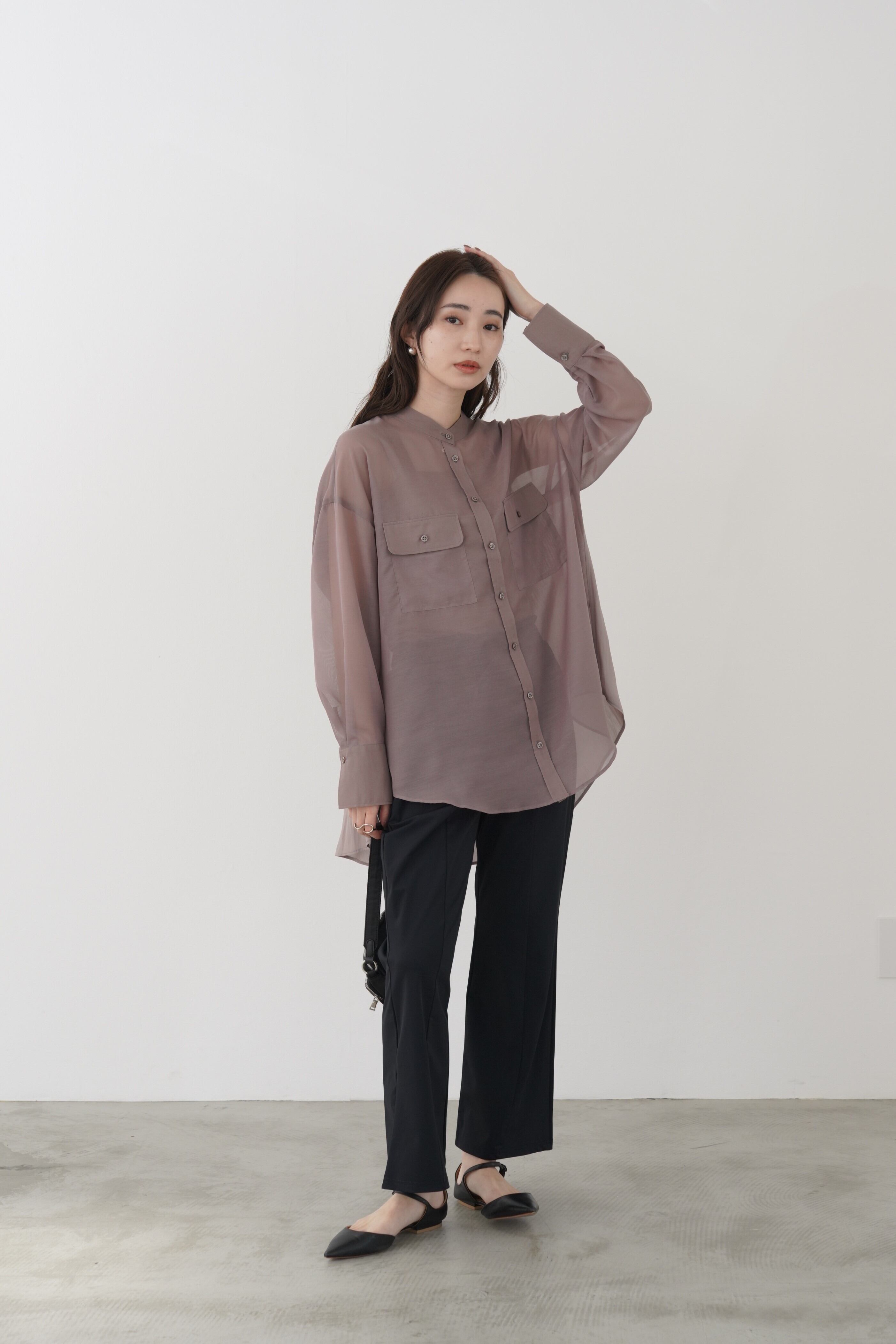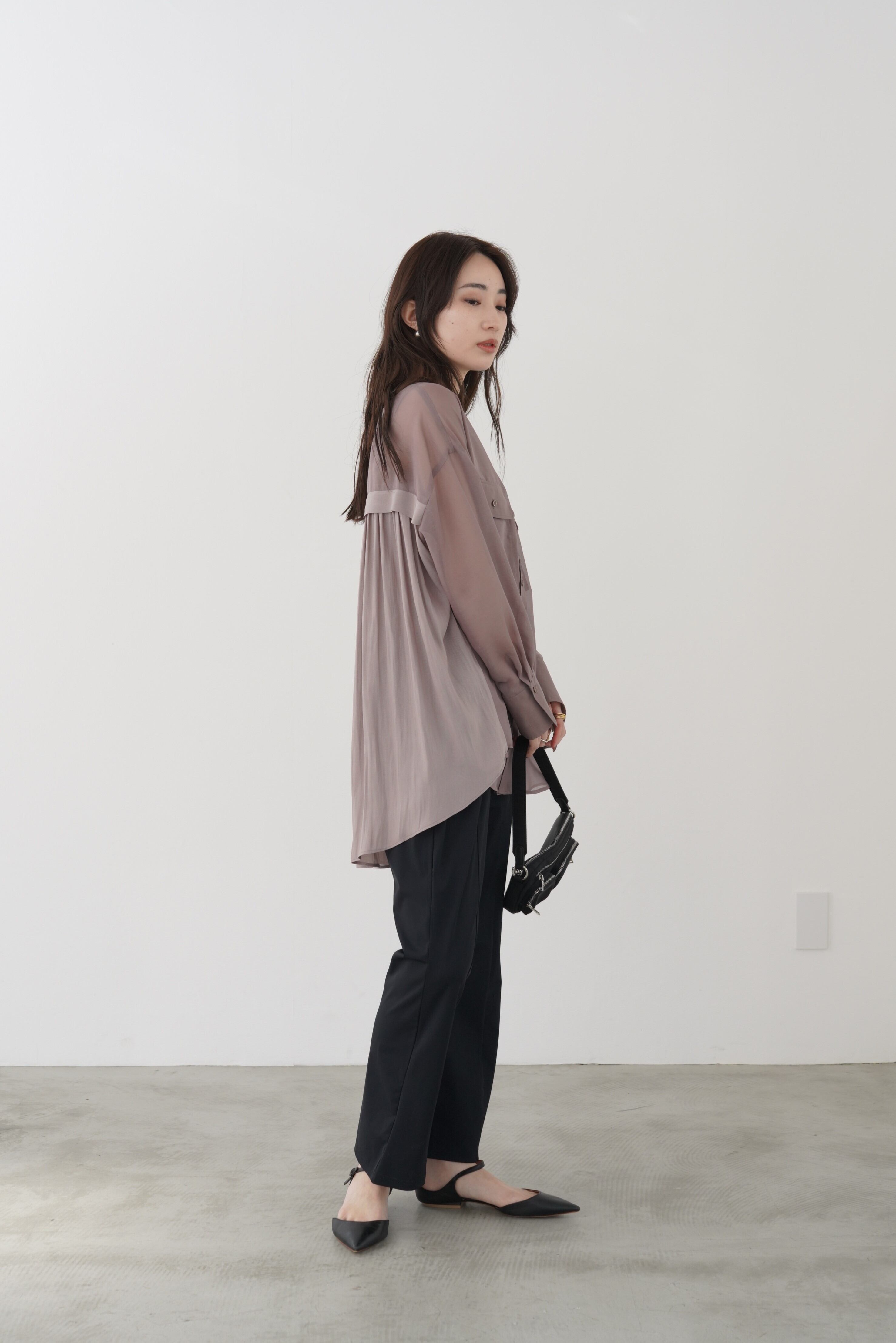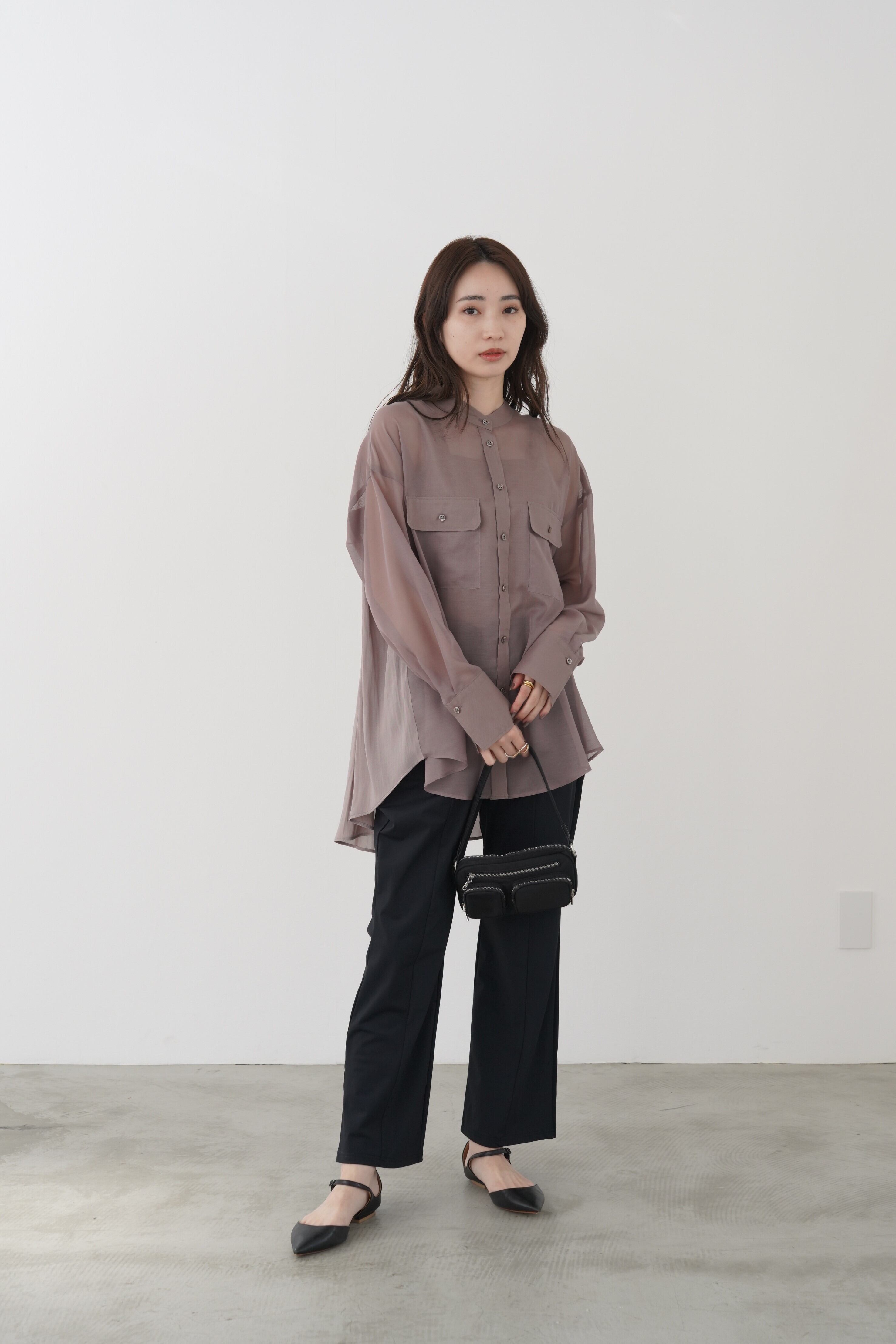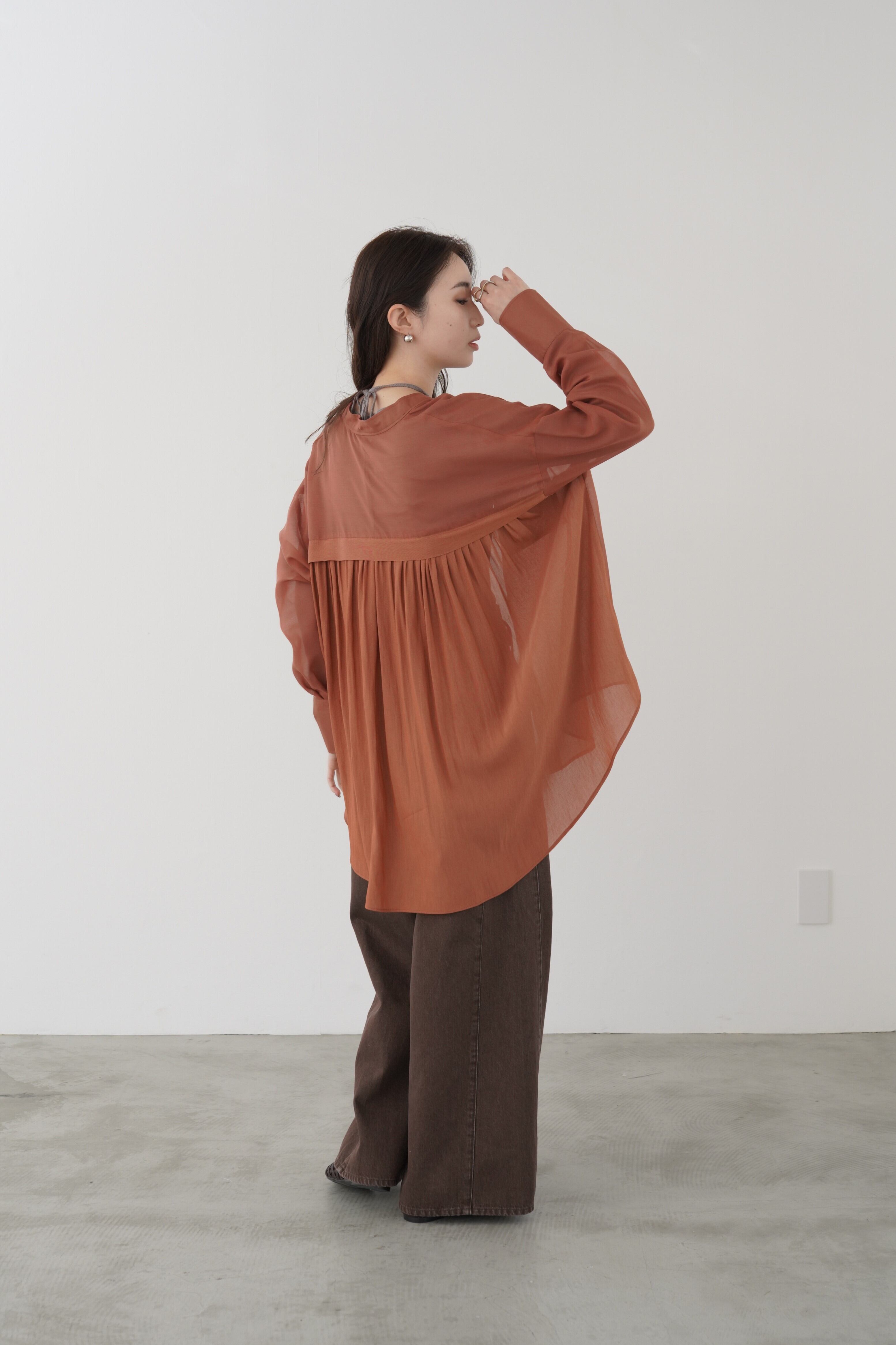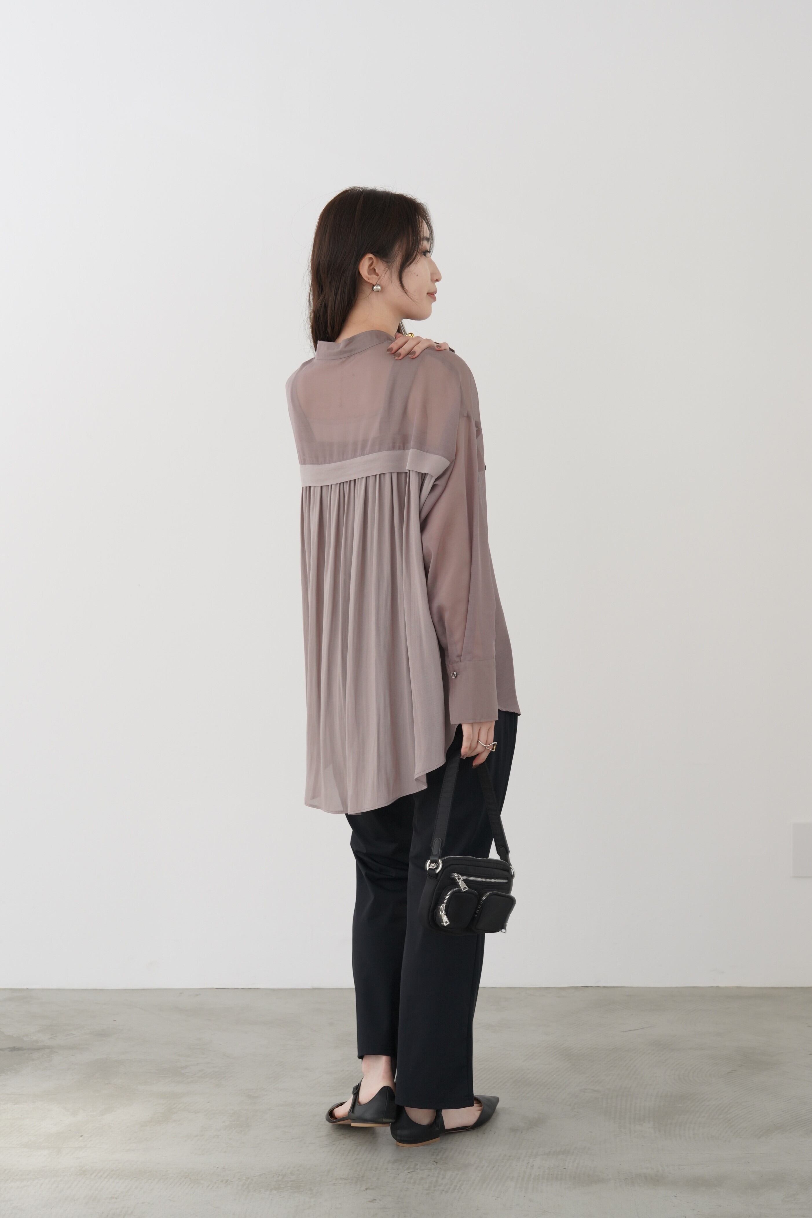 控えめな光沢のブライトスパンボイルのノーカラーシャツ。後ろ身頃をソフトな割繊ジョーゼット素材で切り替えて、ギャザーの映えるディテールに仕上げました。長めの着丈で脇上がりのすっきりしたシルエット。程よい透け感があります。
