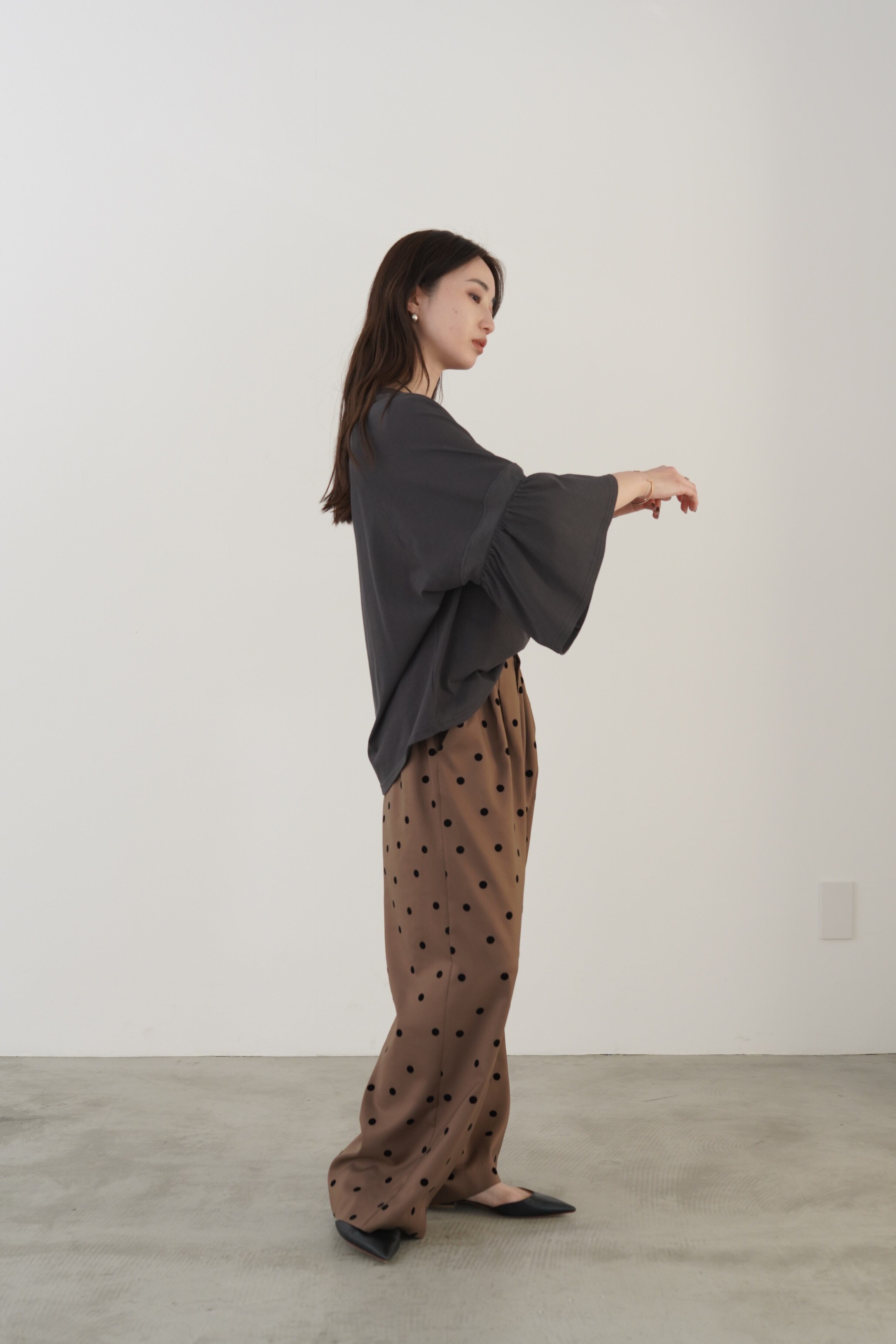 リブを組み合わせた変形スリーブが目を惹くギャザースリーブトップス。従来のカットソーより圧倒的に毛羽の少ない、特殊な構造で紡績された着心地の良いドライタッチジャージを使用しています。