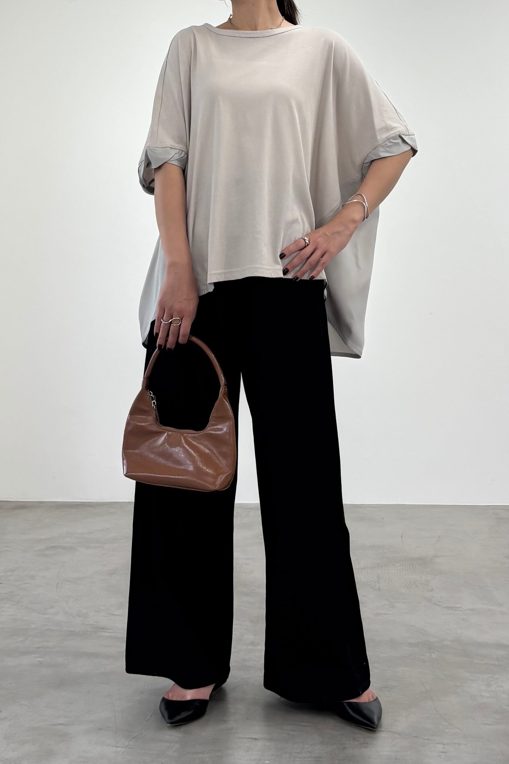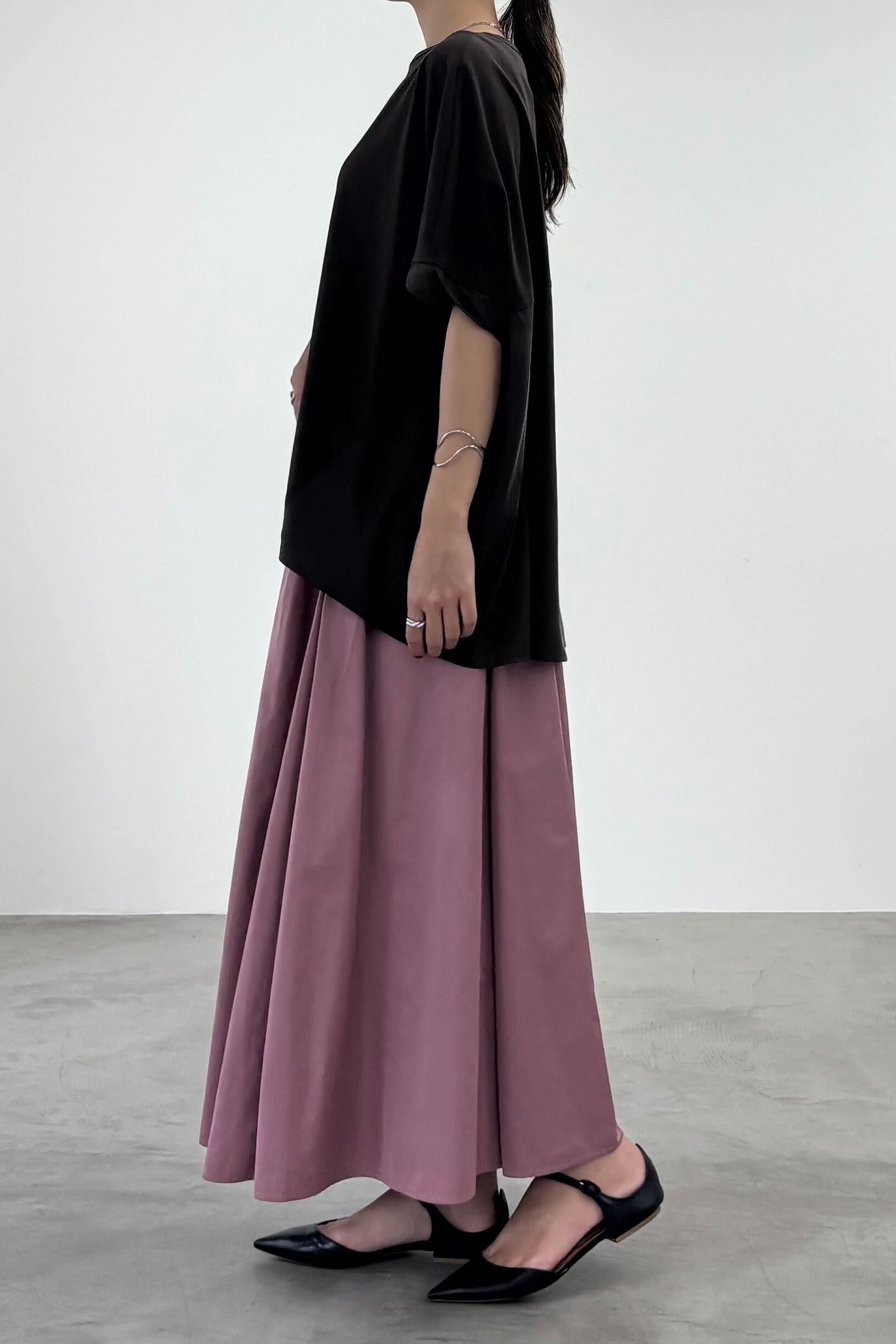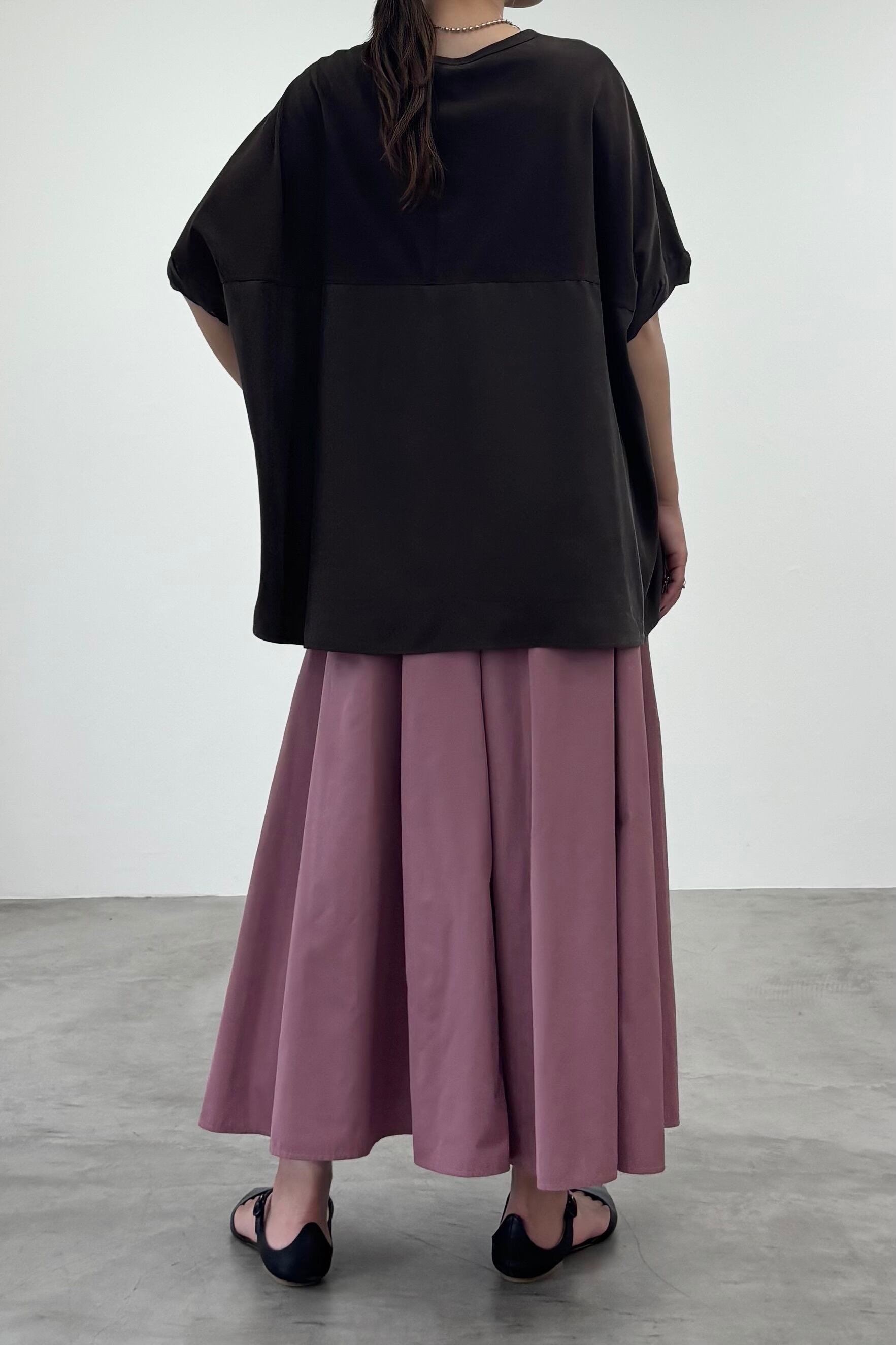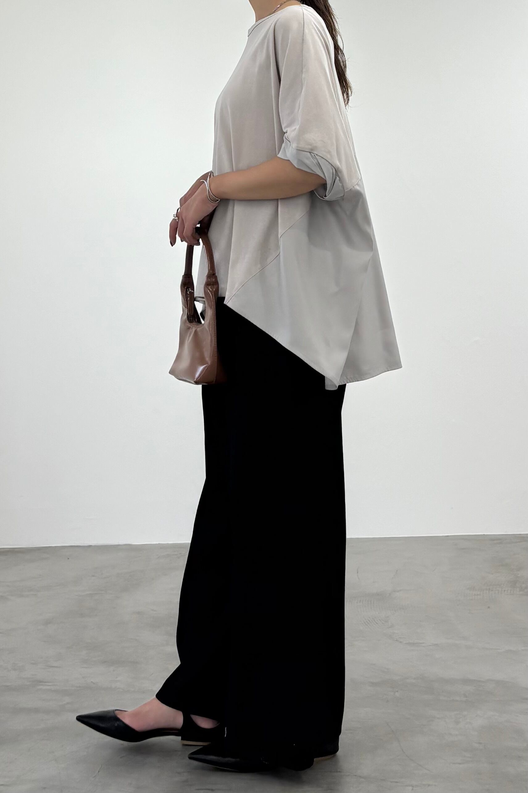 ドライタッチなカットソーとほんのり光沢のあるキュプラを組み合わせたトップス。ドルマンシルエットと素材の切り替えでシンプルながらもデザインのある1枚に。デイリーコーデに取り入れたいアイテムです。
