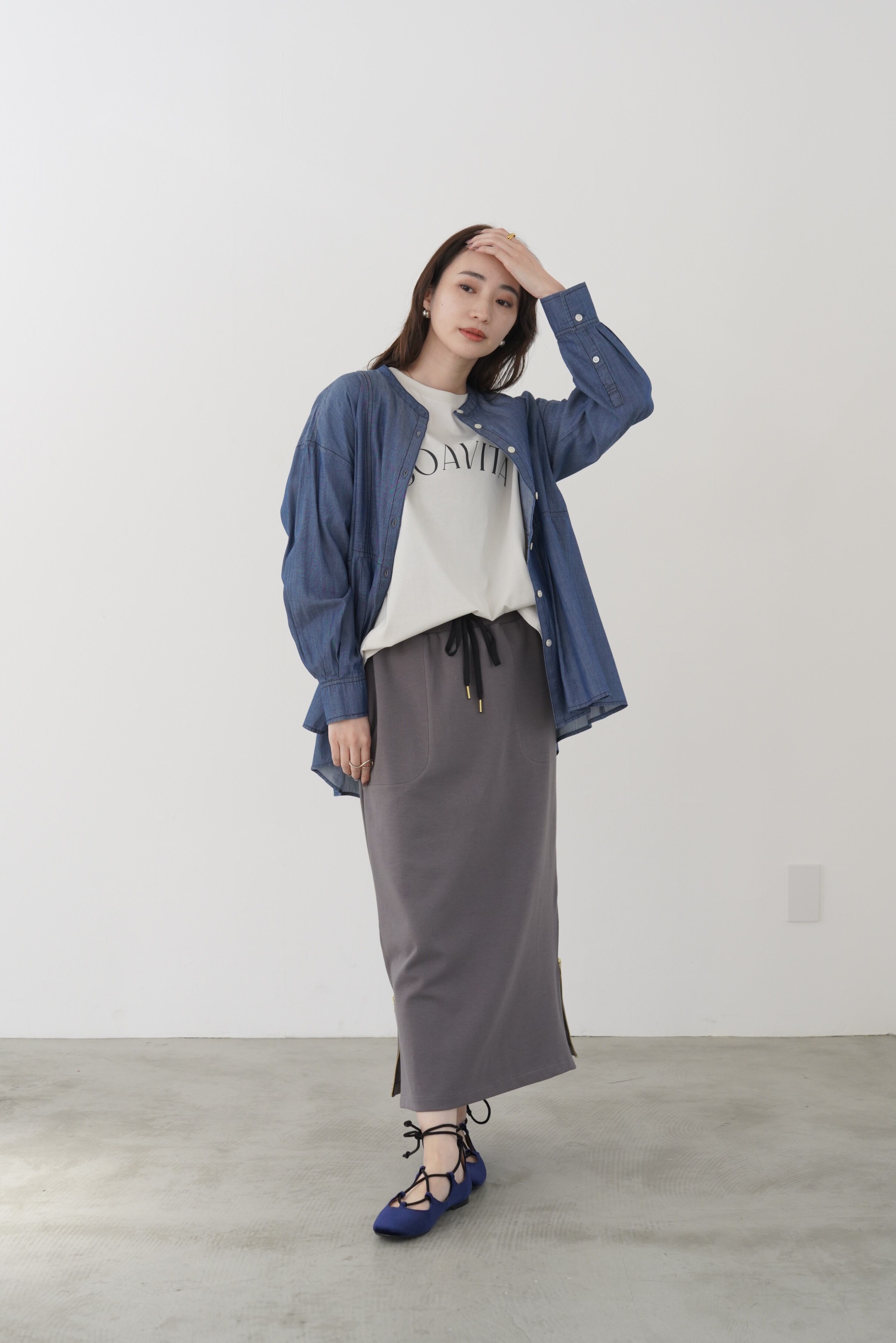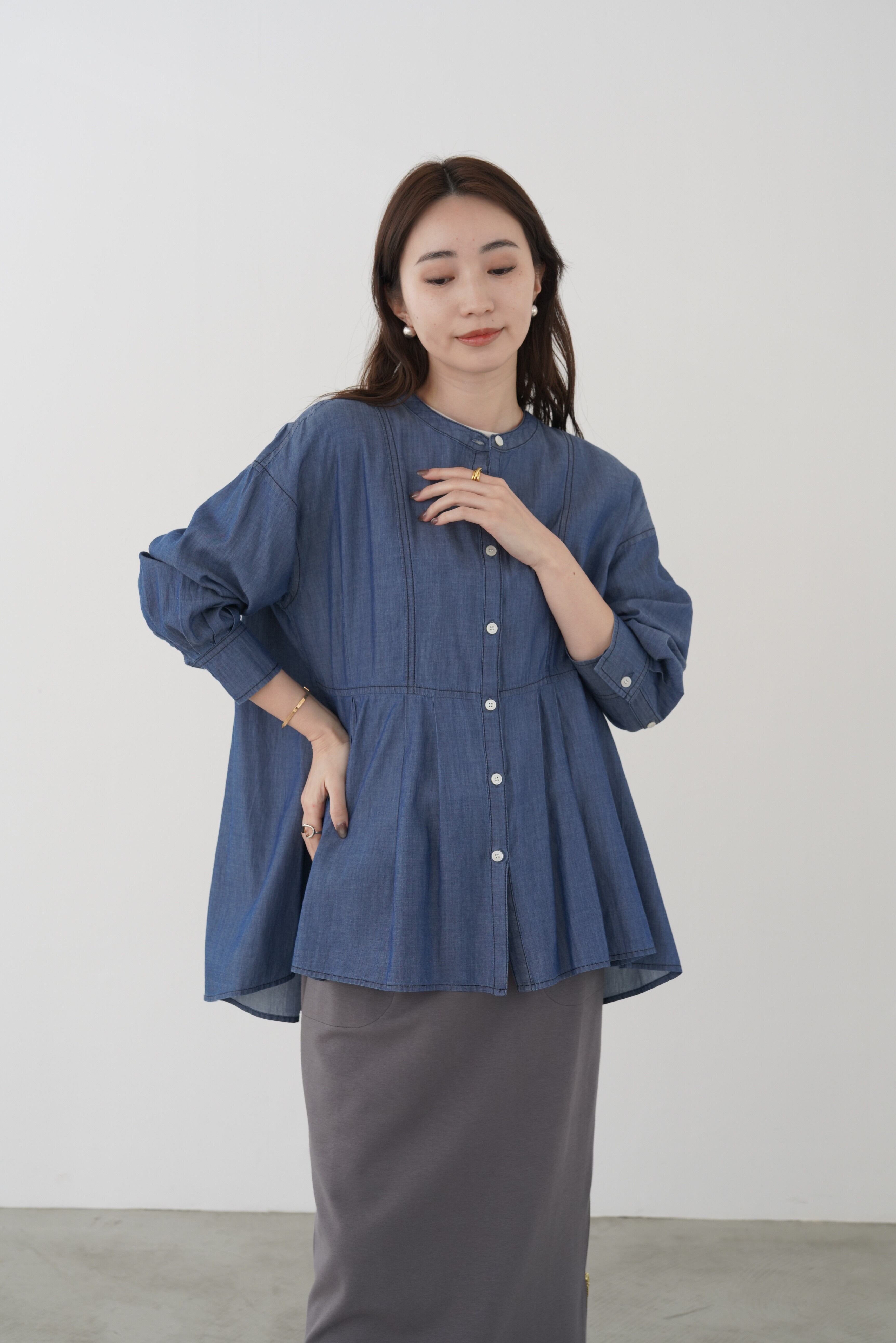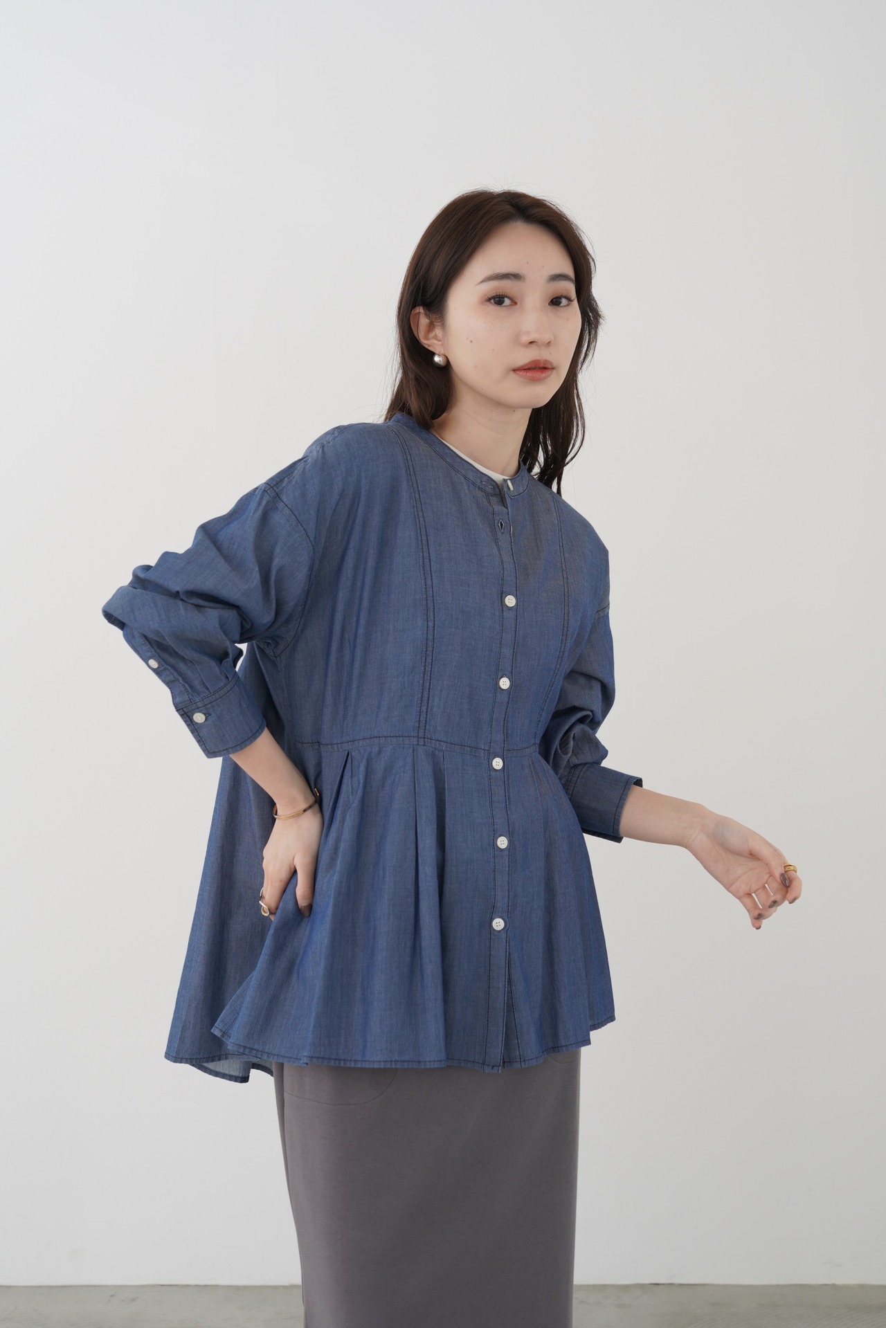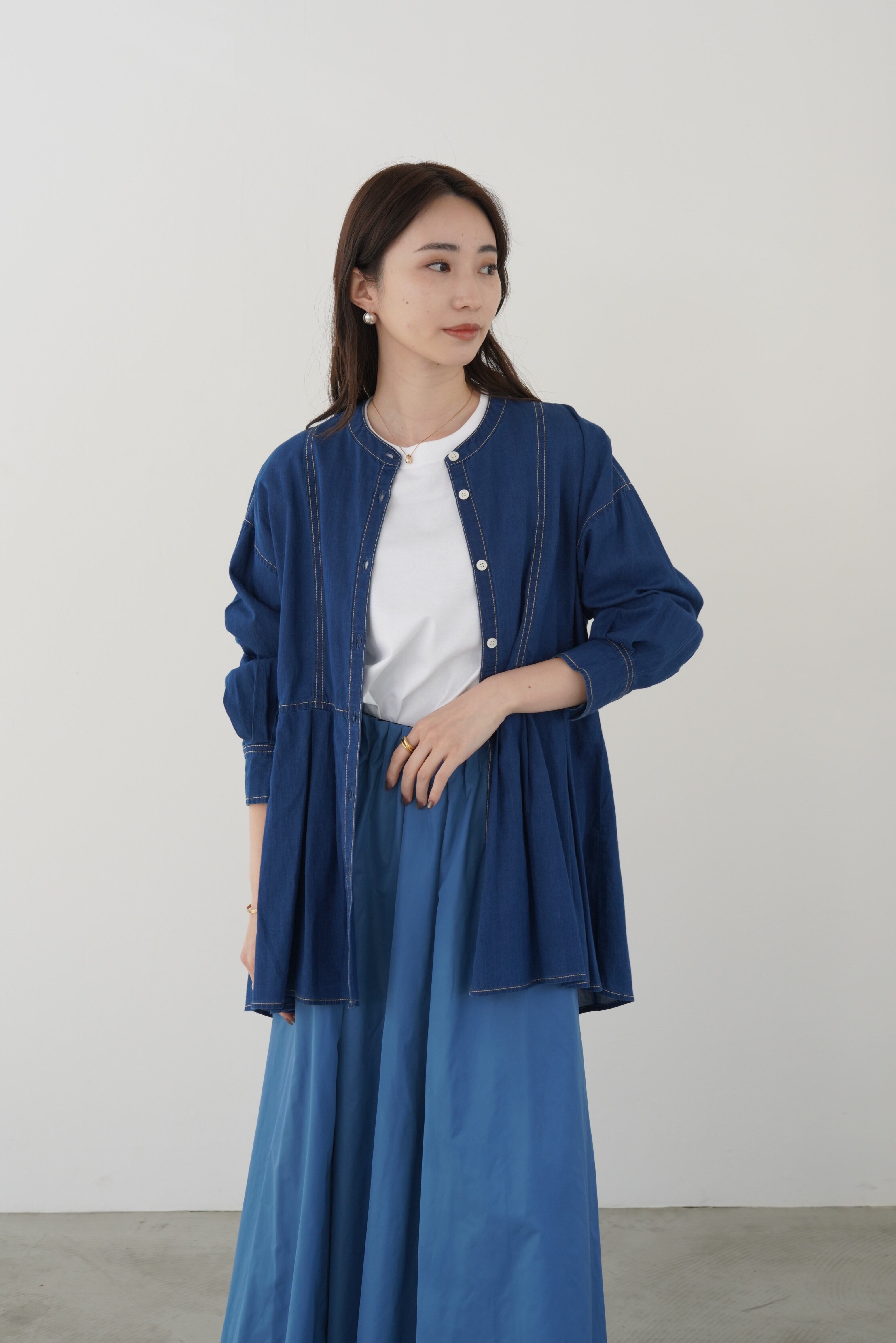 柔らかく軽い2オンスのデニムを私用した、デニムならではの加工感が特徴のブラウス。ウエストから広がるペプラムシルエットでヒップをカバーしてくれる着丈です。羽織としても活躍するアイテムです。