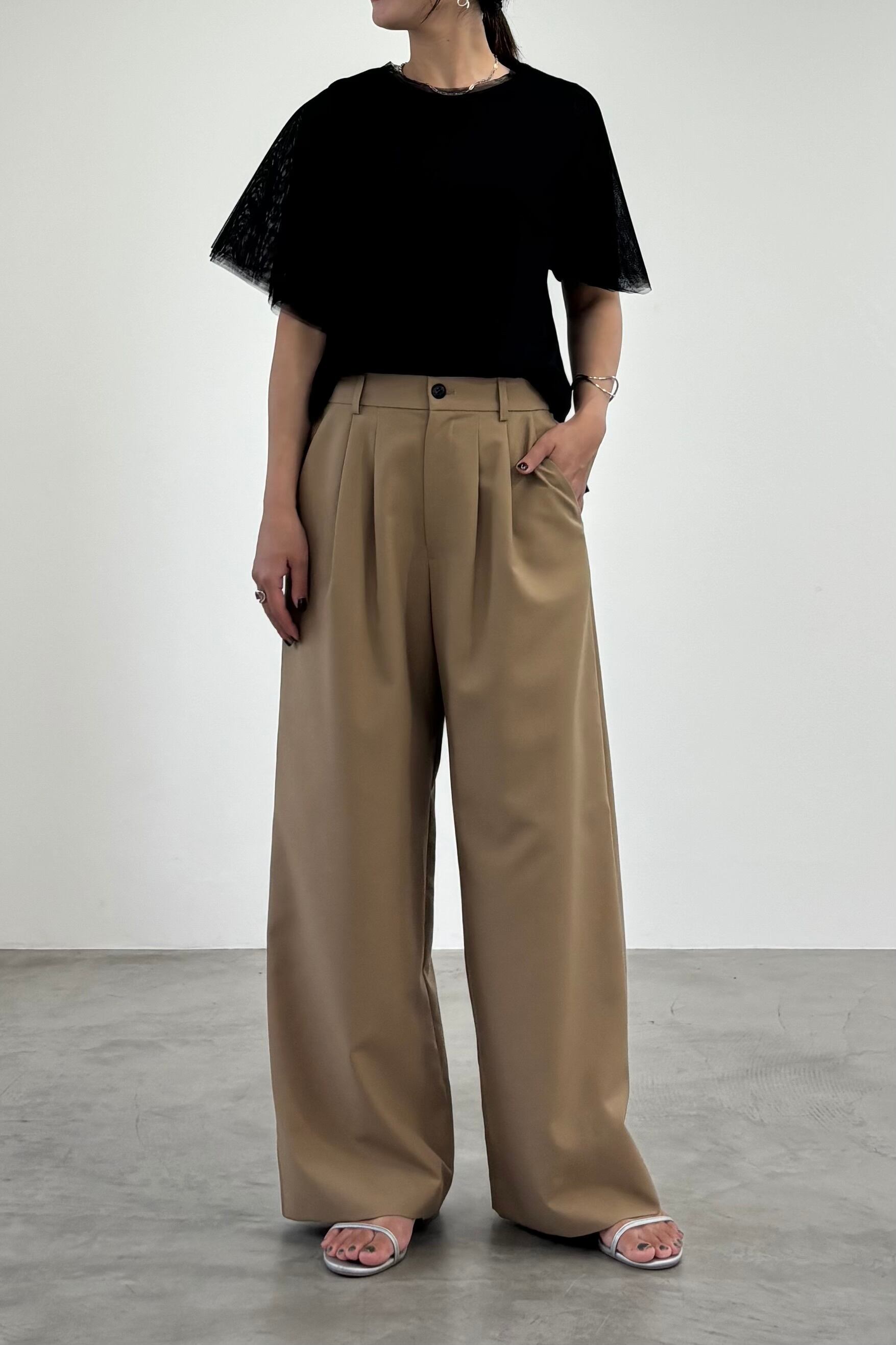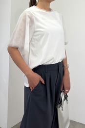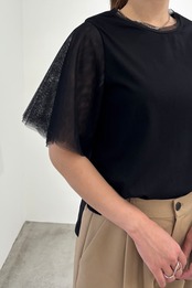 肌あたりのいい柔らかな身頃に、程よい透け感のあるチュールを袖とネックに取り入れたカットソー。ほんのりハリのあるチュール素材が上品で女性らしいシルエットを演出します。カジュアルなスタイルにも取り入れやすく、デイリーからお出かけまで幅広く活躍するアイテムです。