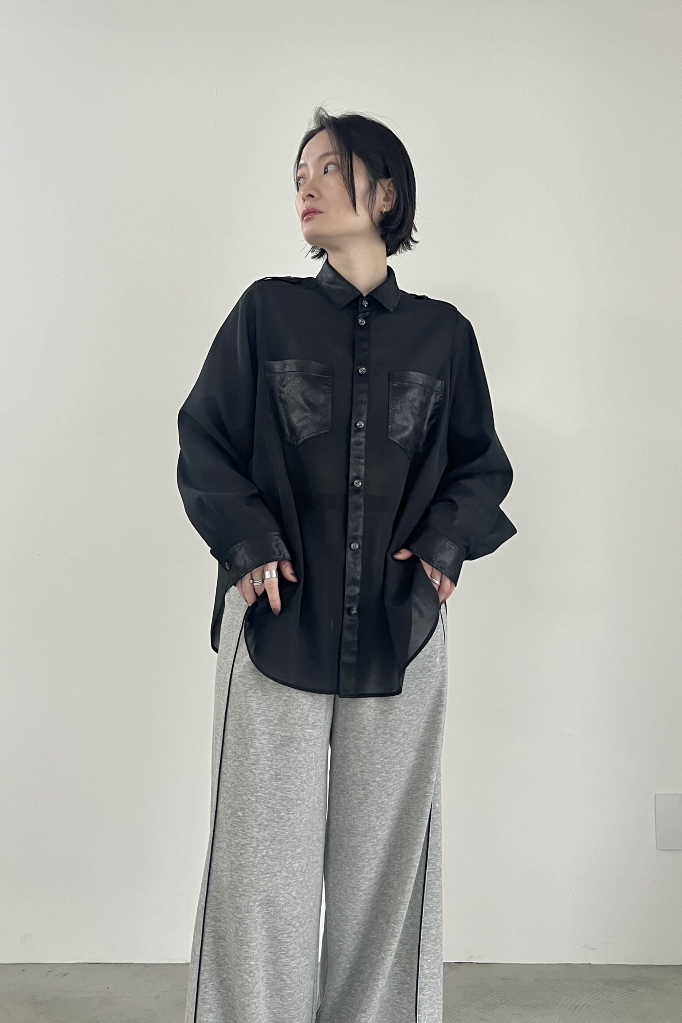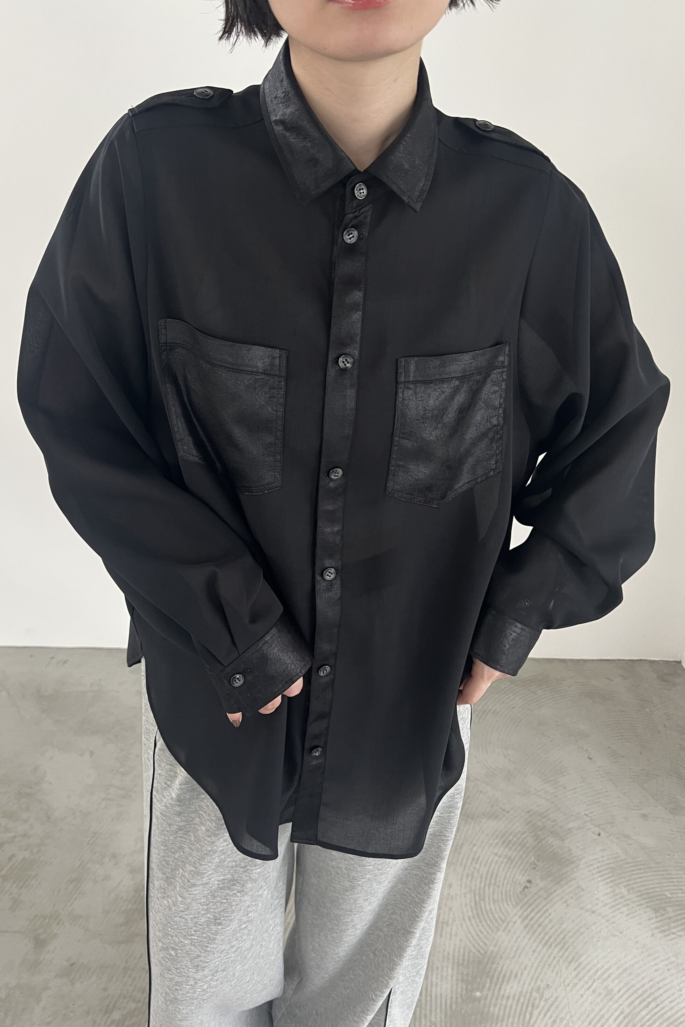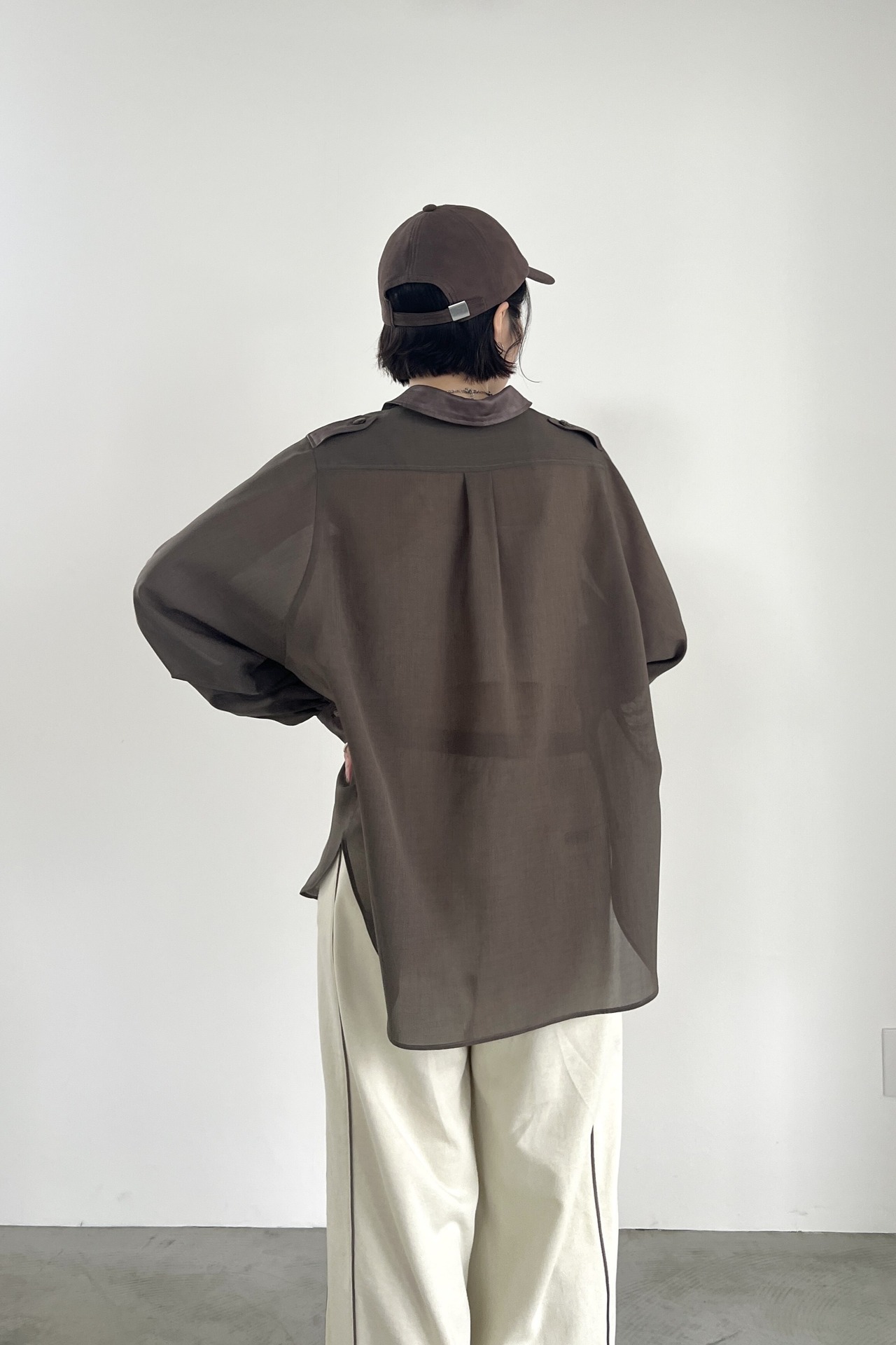 身頃に梳毛(そもう)調素材、衿やカフスにレザー調素材を使用したシーズンムードのあるエポ―レットシャツ。ドライタッチで程良い抜け感があり、サマーウールのような高級感があります。ゆったりとしたサイズ感ですが、肩をドロップさせないことで、エポ―レット付きでも華奢見えにするように拘りました。