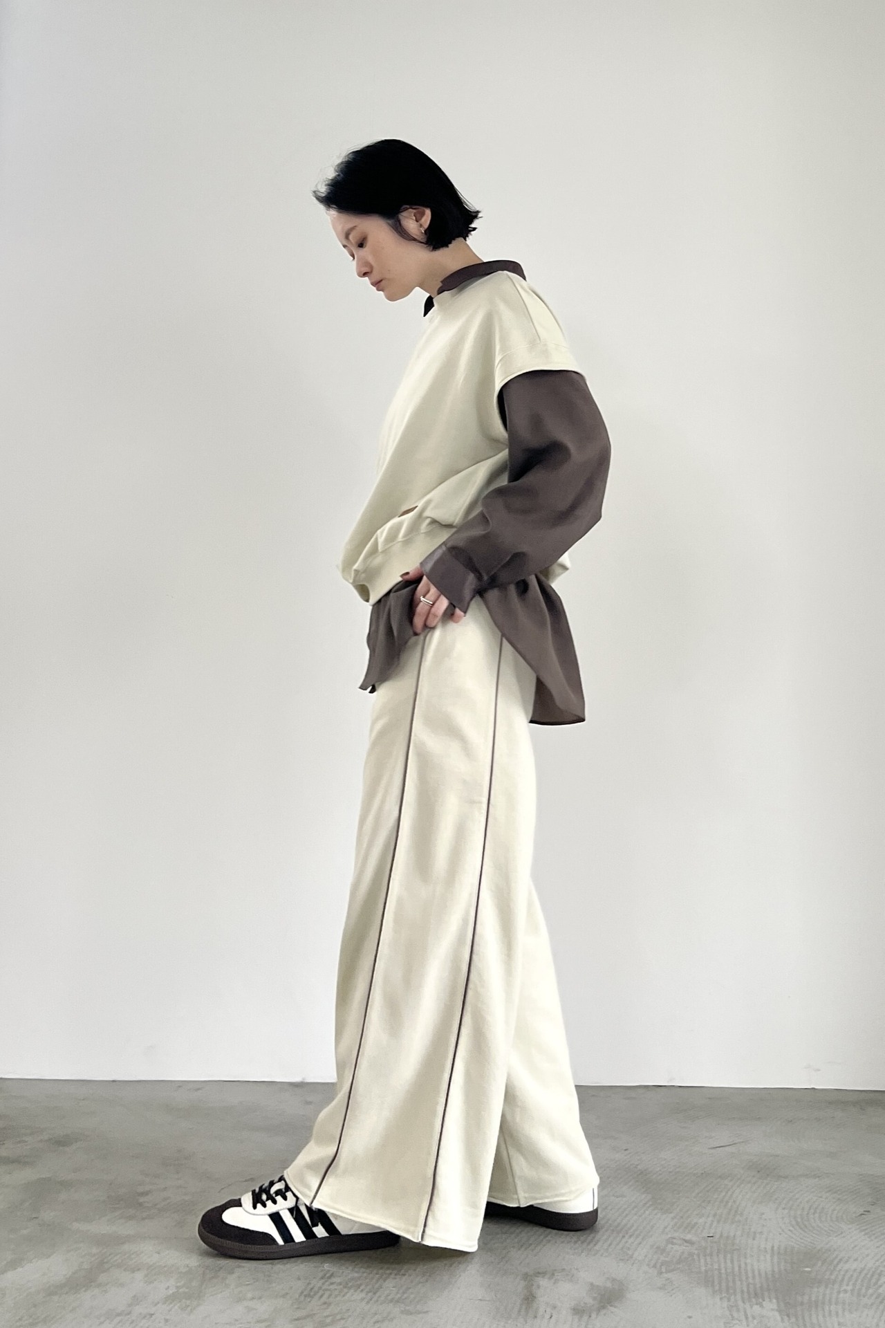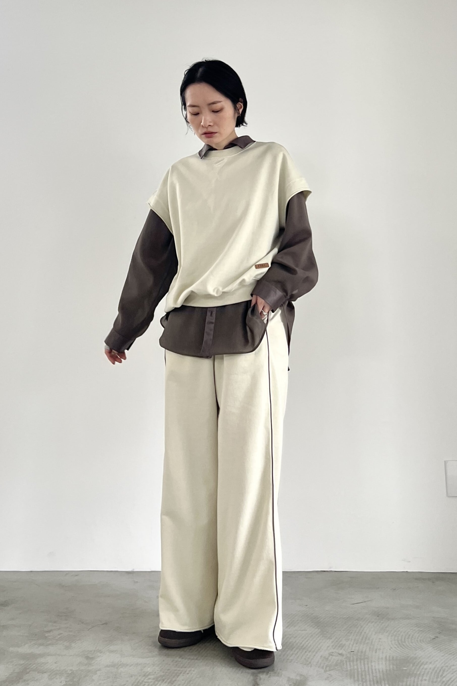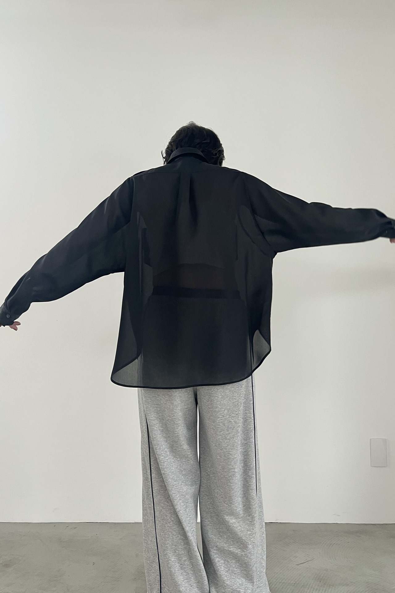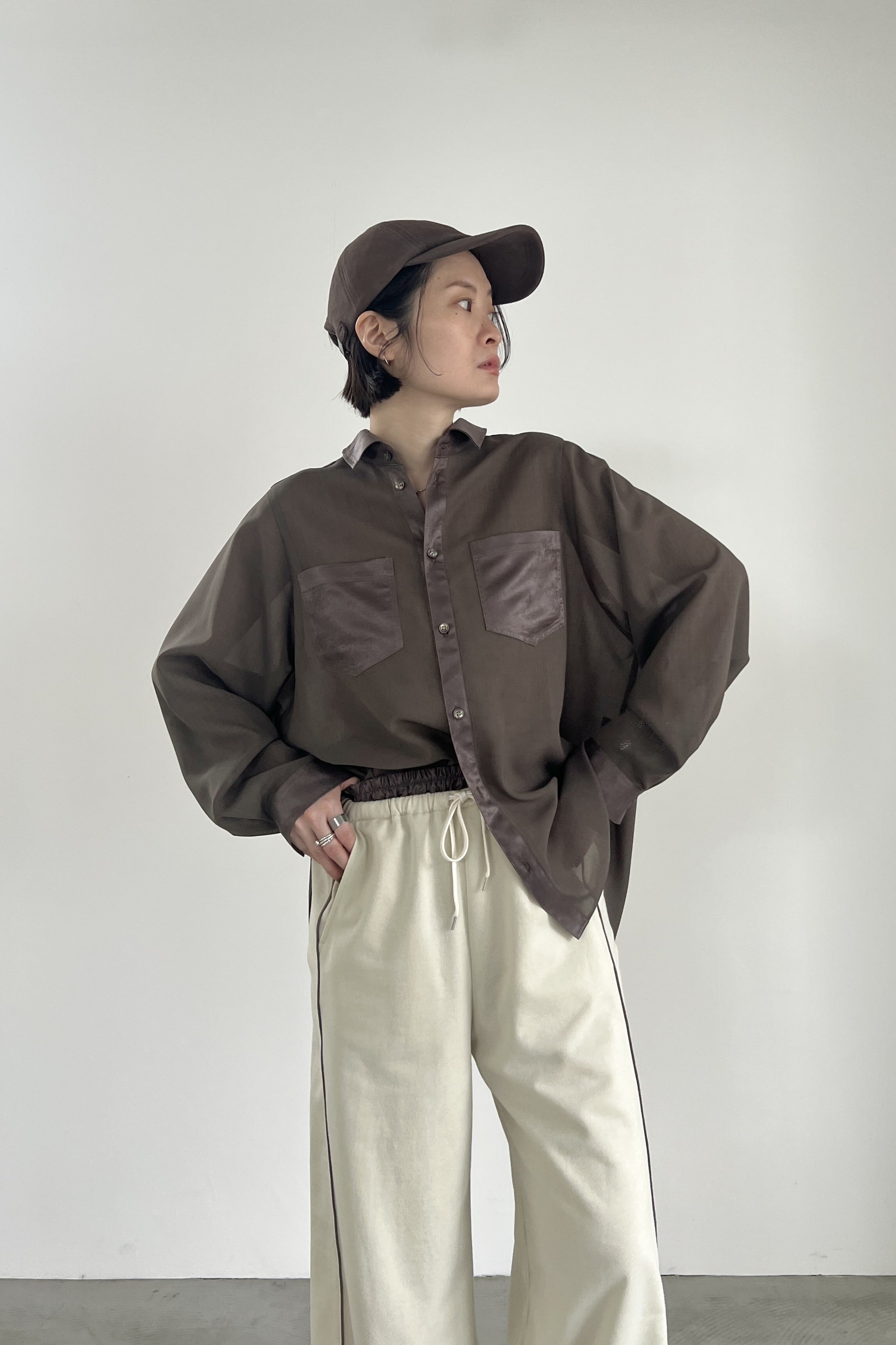 身頃に梳毛(そもう)調素材、衿やカフスにレザー調素材を使用したシーズンムードのあるエポ―レットシャツ。ドライタッチで程良い抜け感があり、サマーウールのような高級感があります。ゆったりとしたサイズ感ですが、肩をドロップさせないことで、エポ―レット付きでも華奢見えにするように拘りました。
