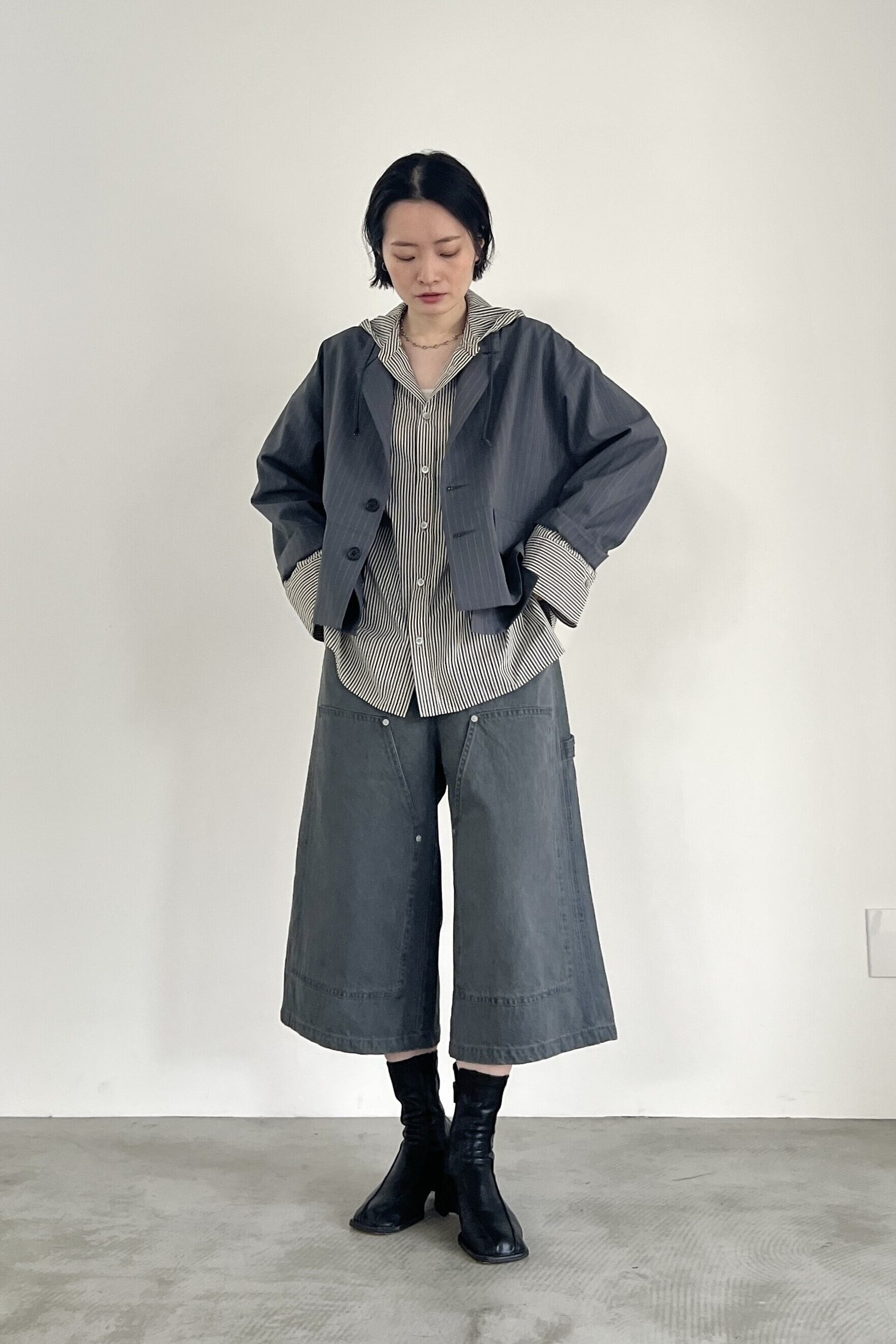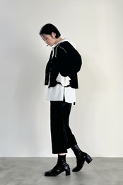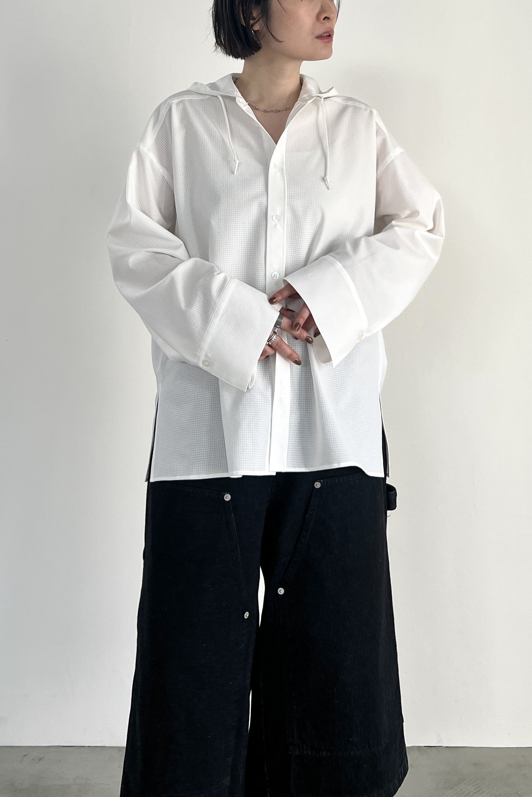 通気性、軽量感のある快適機能素材のドットエアーを使用したフーディーシャツ。単品・羽織・インナーの、どの着方も使いやすいサイズ感や、短丈アウターにも相性の良い丈感に拘りました。あえて広めに設定したカフスもポイントです。