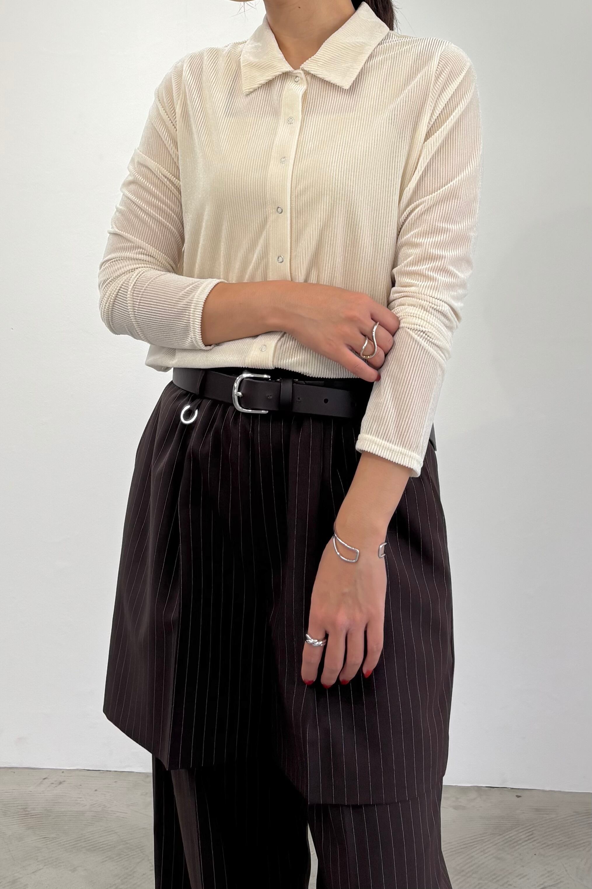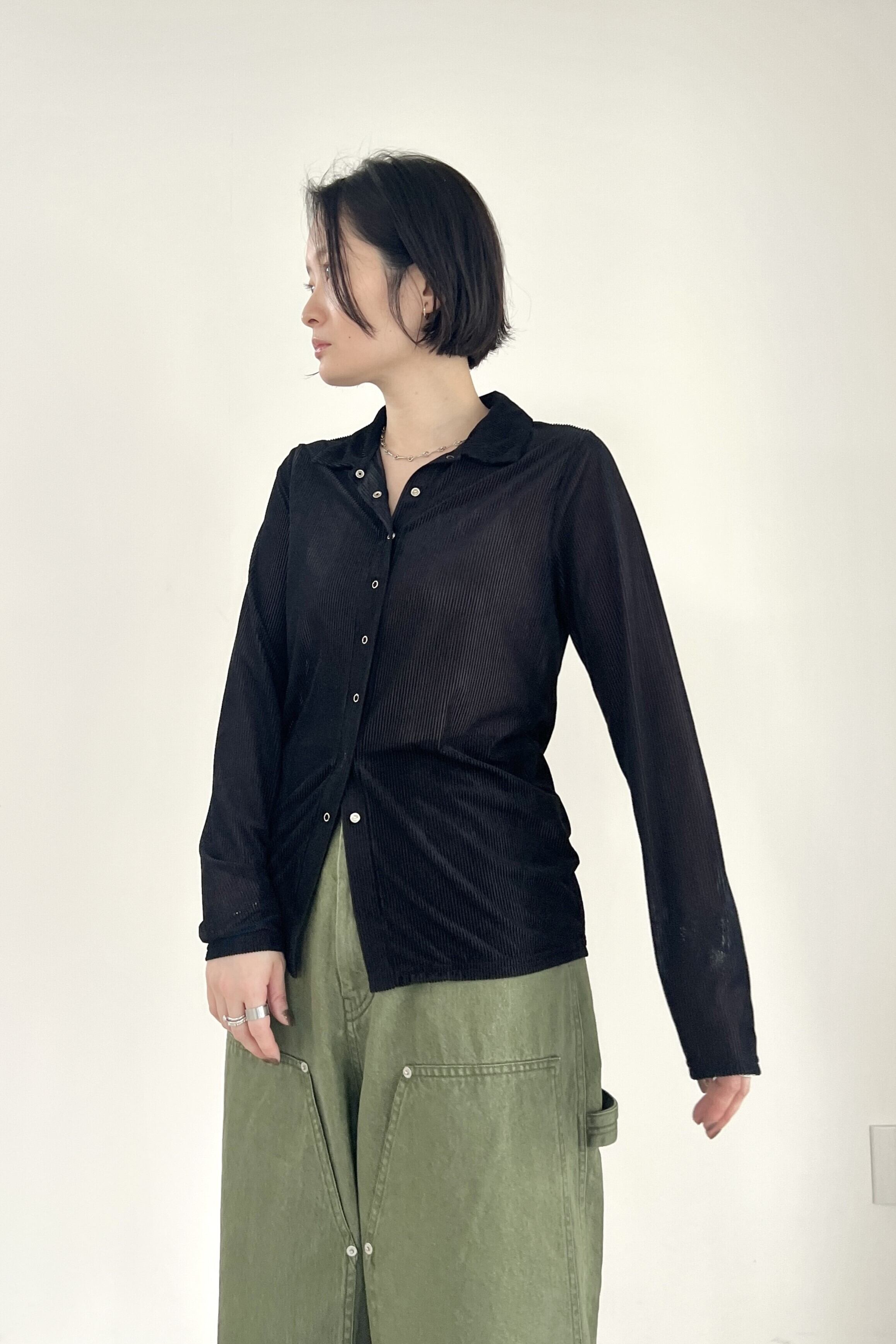 リブのような表面感が特徴のシアーベロア素材を使用したカットソーシャツ。程良い透け感とベロア特有の光沢感があり、衿付きなので綺麗めにもカジュアルにも合わせやすいトレンド感のあるシャツです。