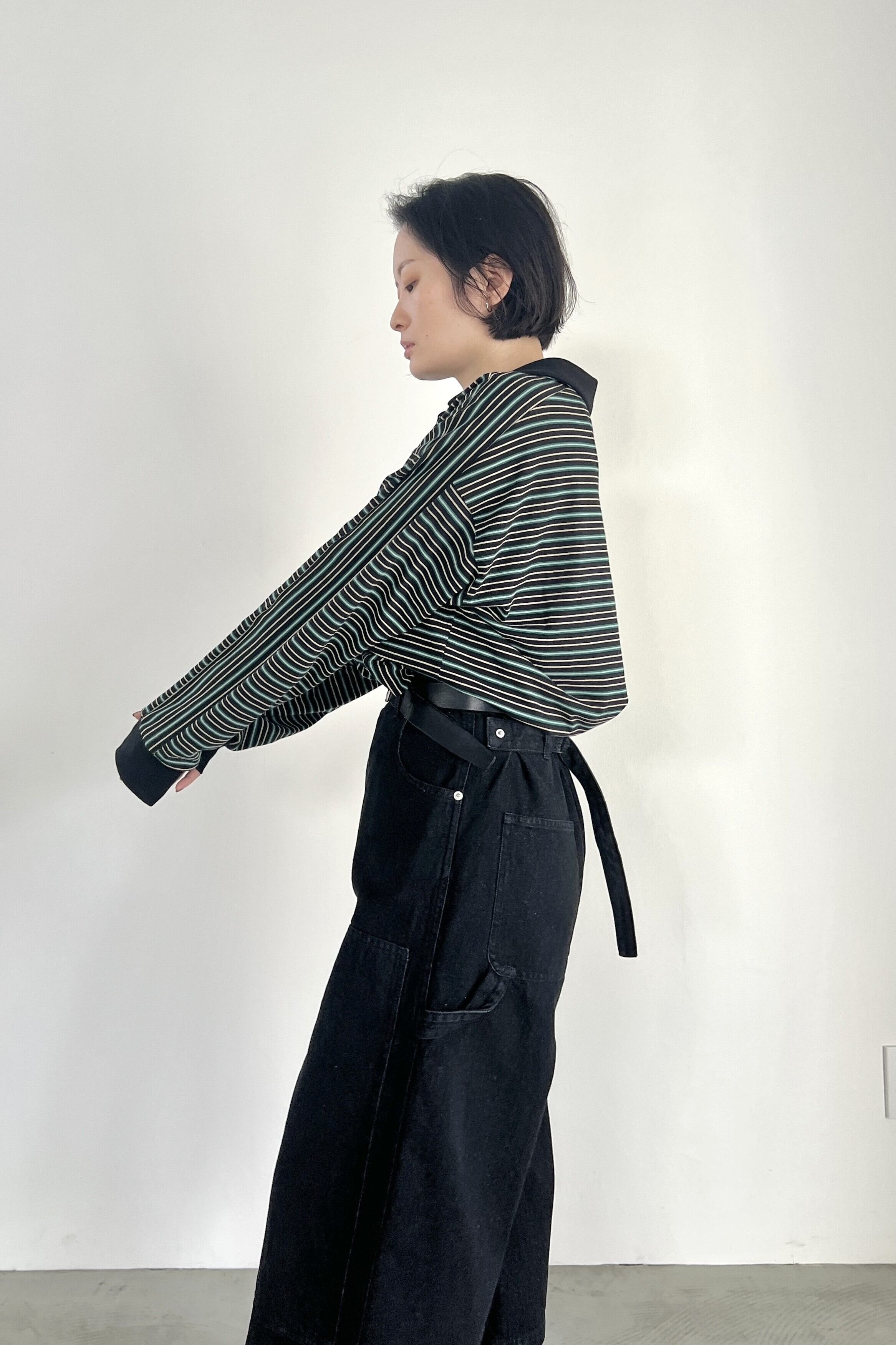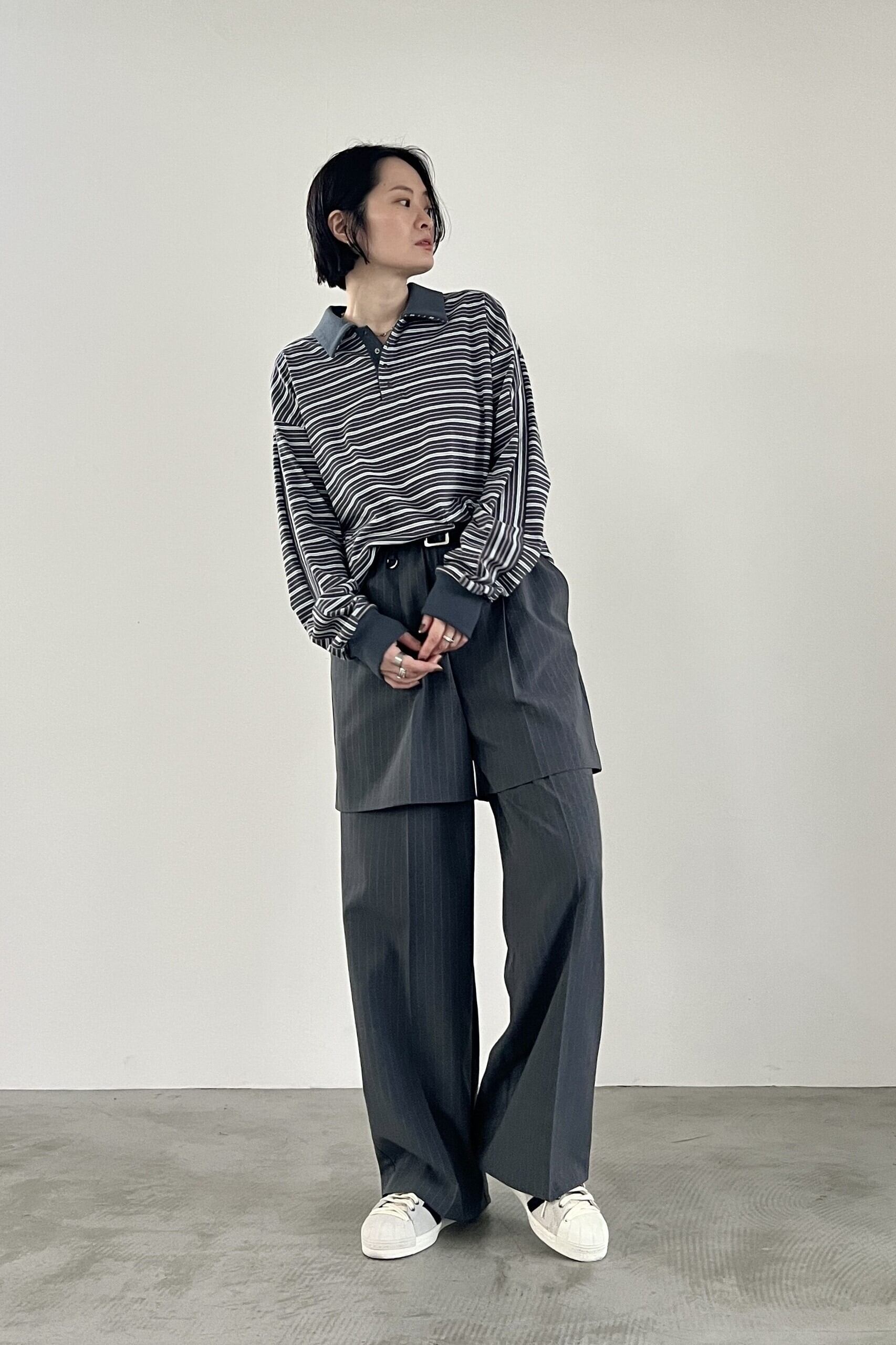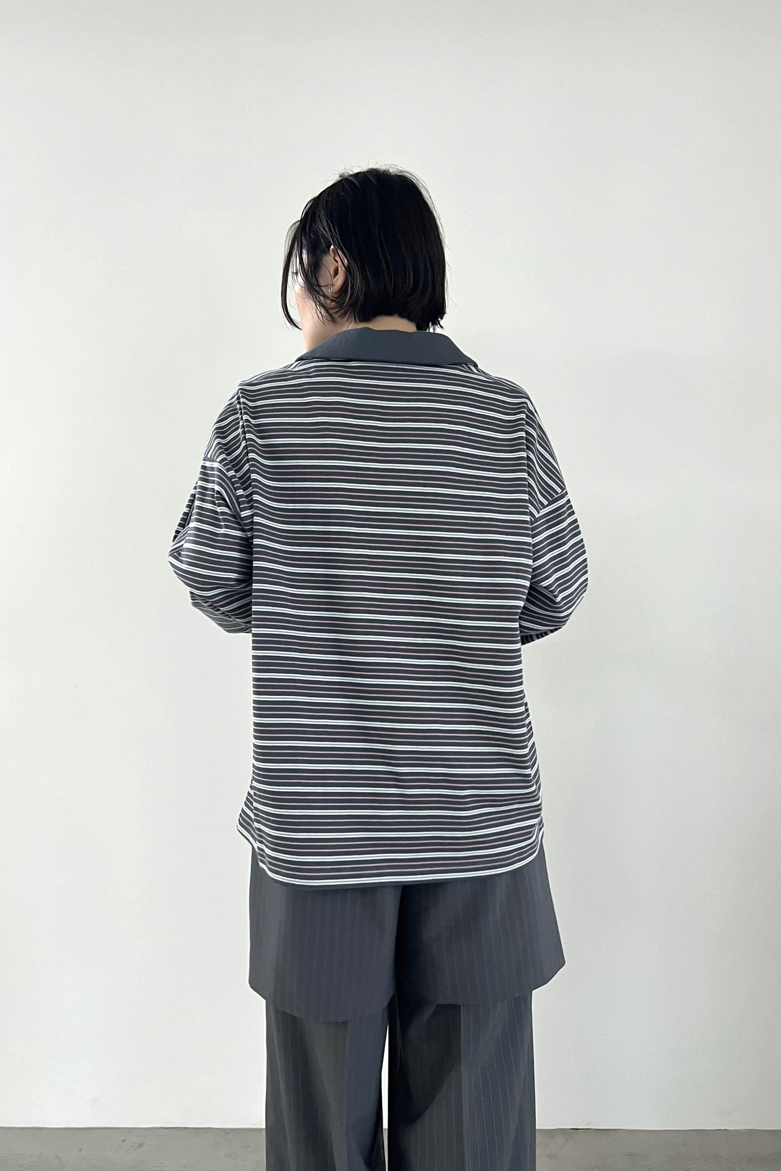 マルチボーダー天竺を使用したラガーシャツ。大人が着やすい落ち着いた配色の細ボーダー柄で、スタイリングに鮮度をプラスしてくれるアイテムです。艶のあるブラックニッケルのドットボタン、袖のストライプ柄がアクセントになっています。