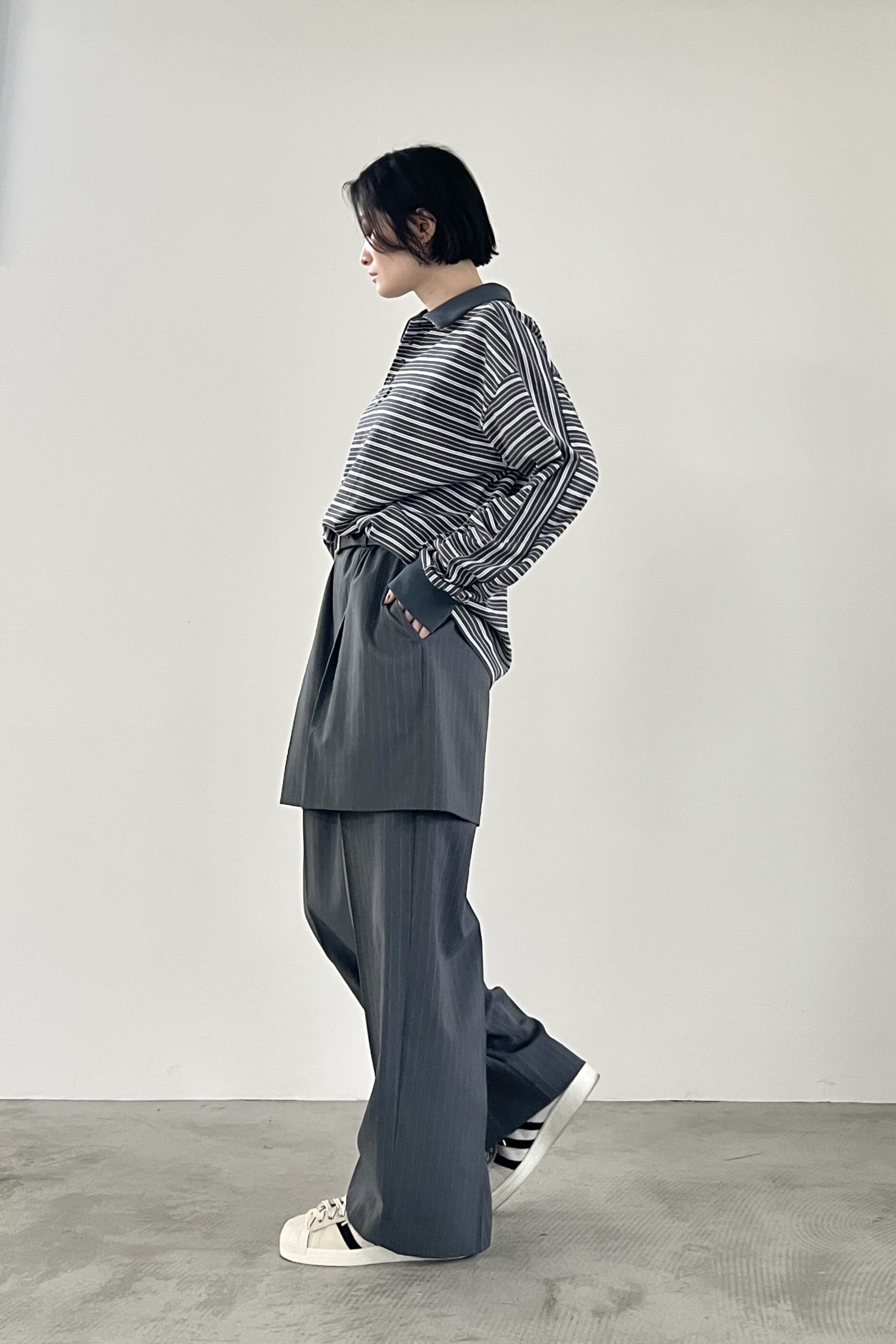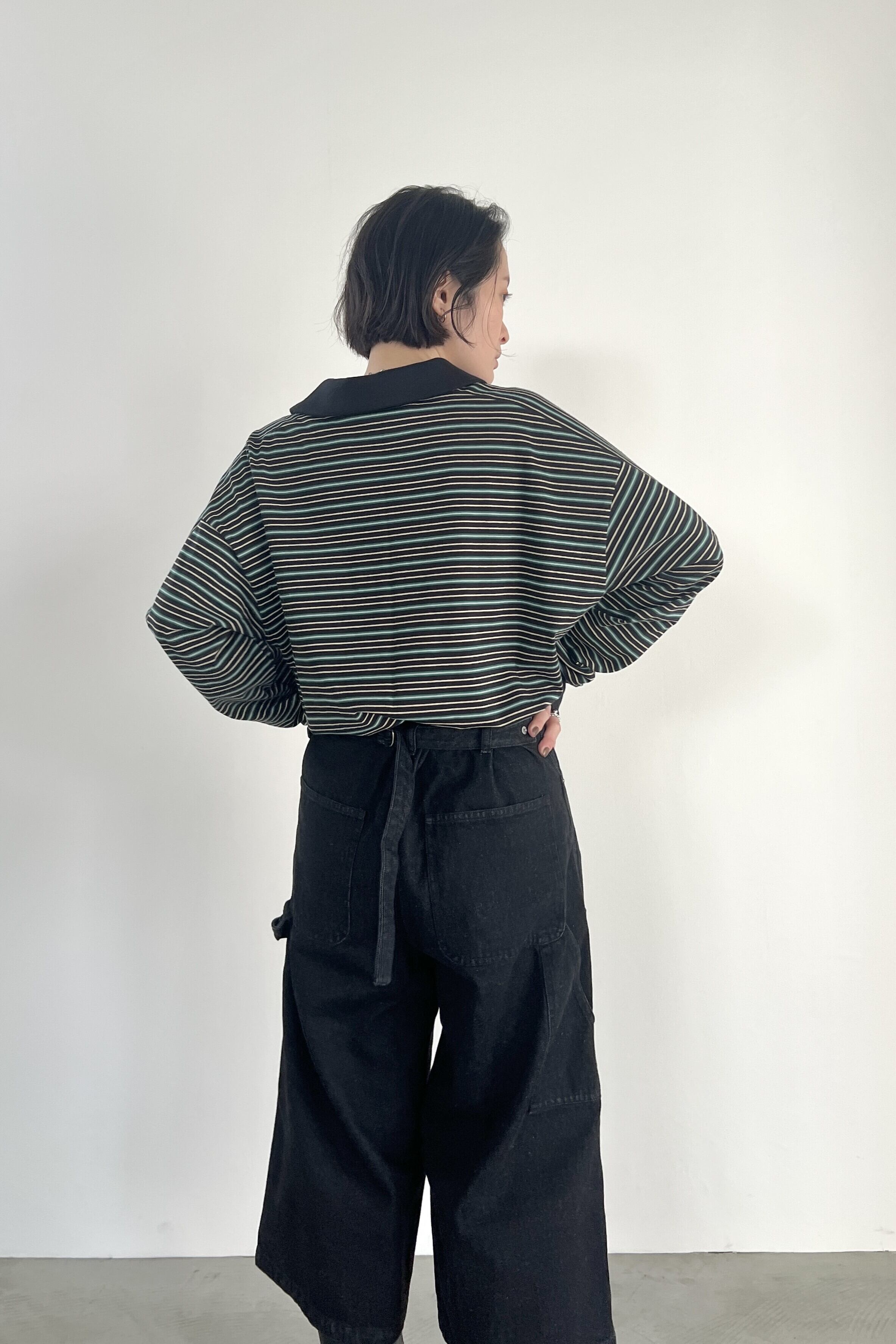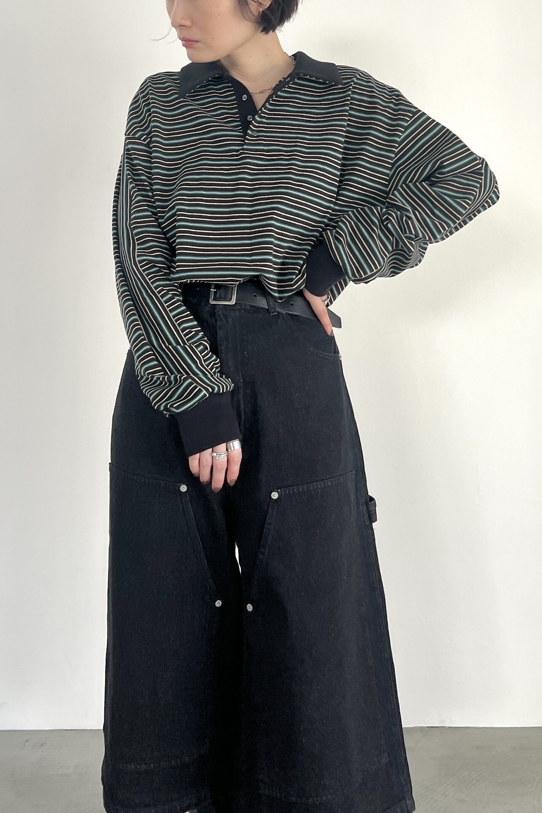 マルチボーダー天竺を使用したラガーシャツ。大人が着やすい落ち着いた配色の細ボーダー柄で、スタイリングに鮮度をプラスしてくれるアイテムです。艶のあるブラックニッケルのドットボタン、袖のストライプ柄がアクセントになっています。