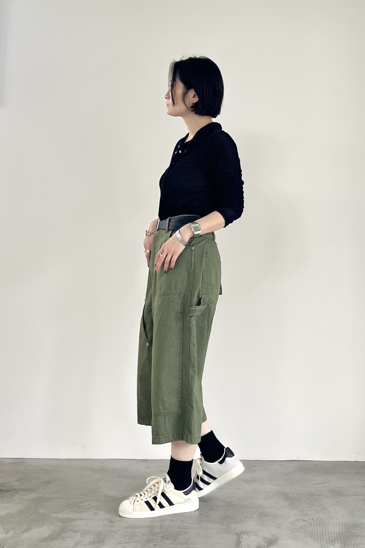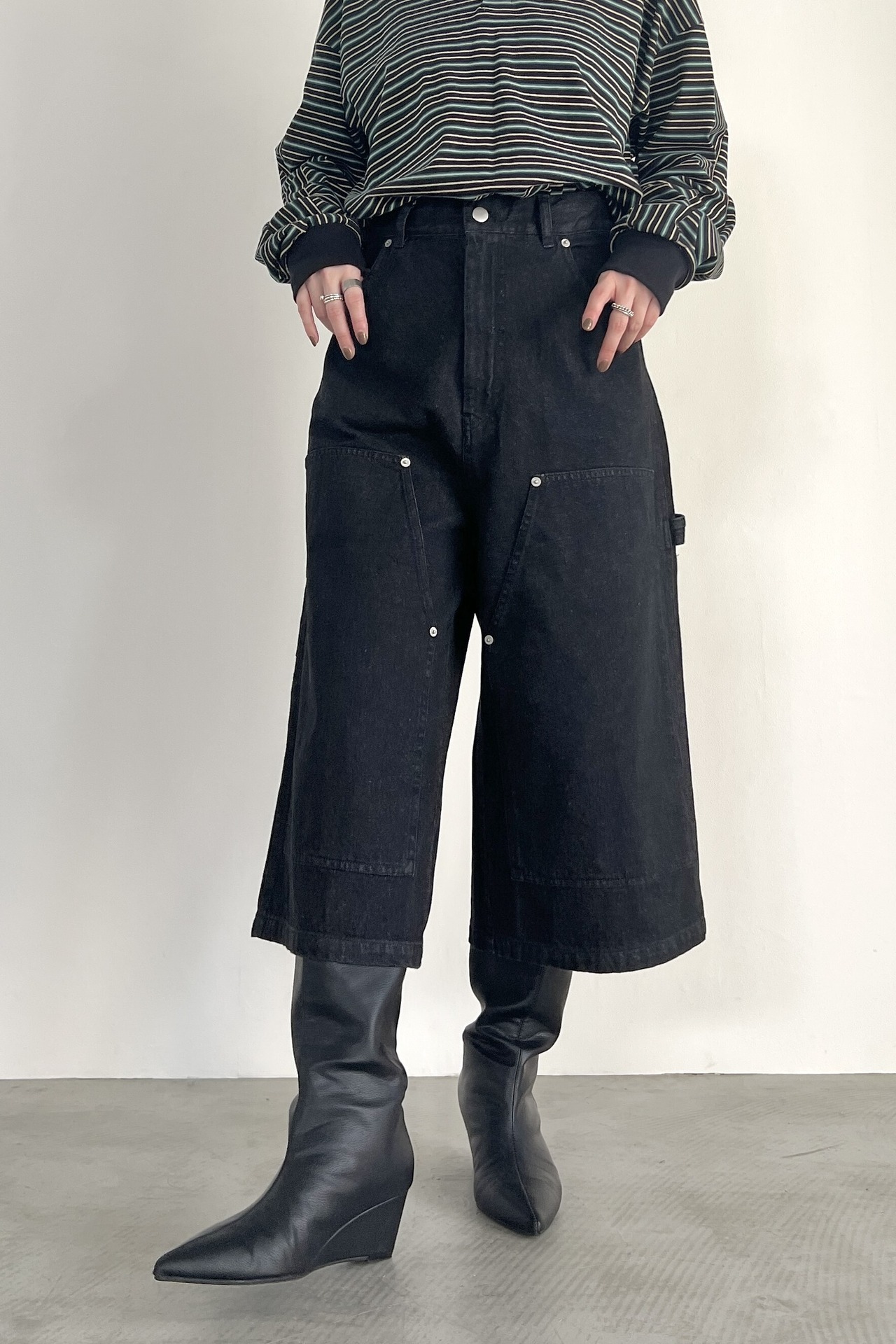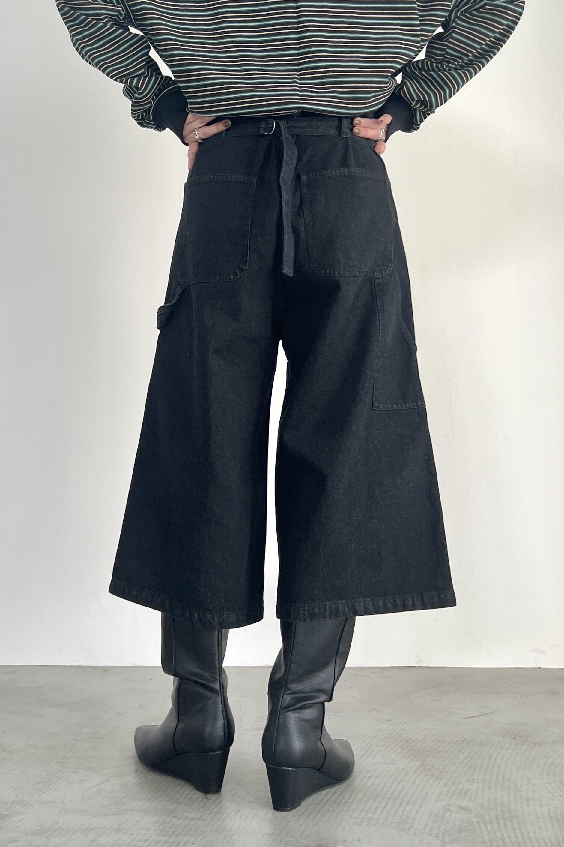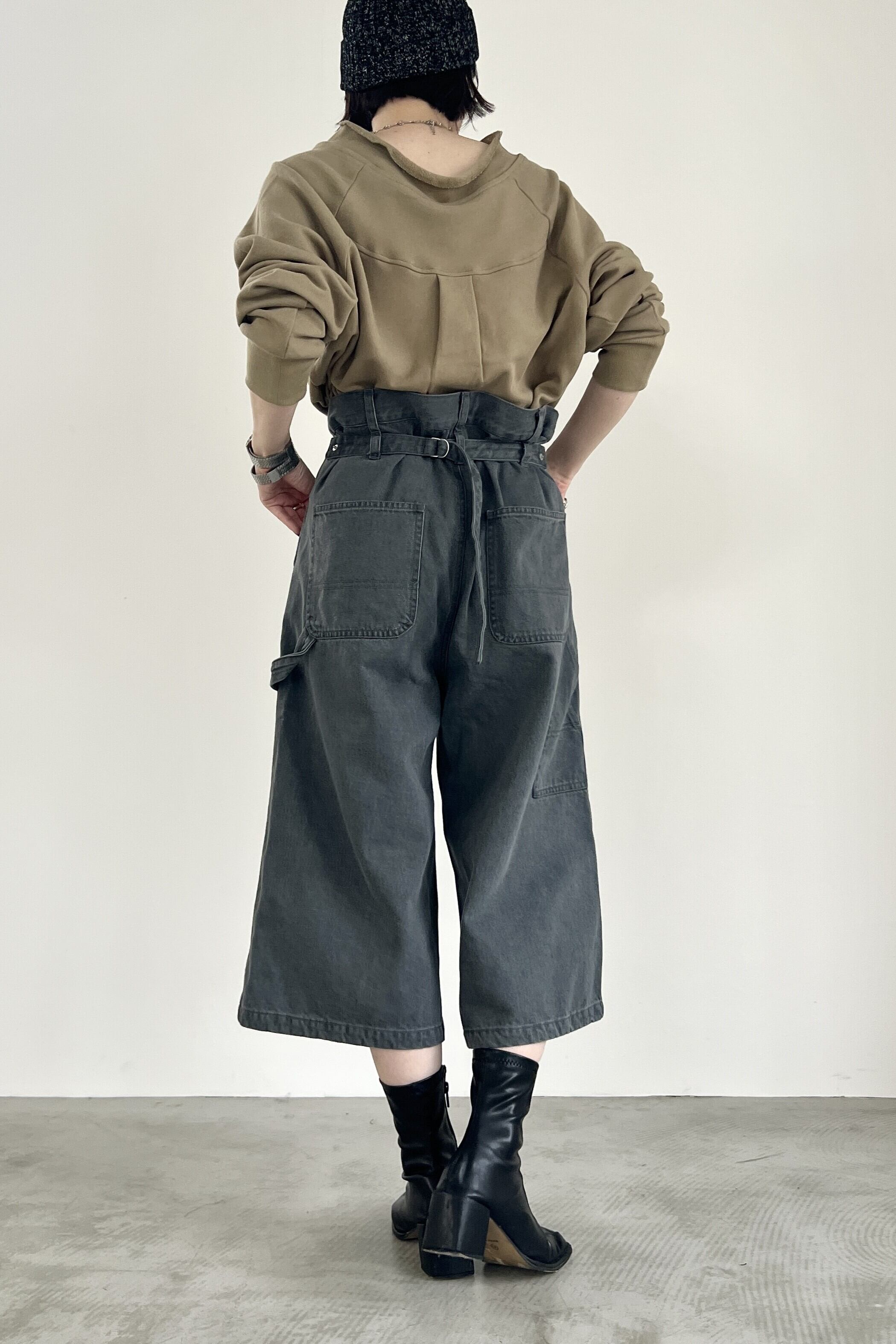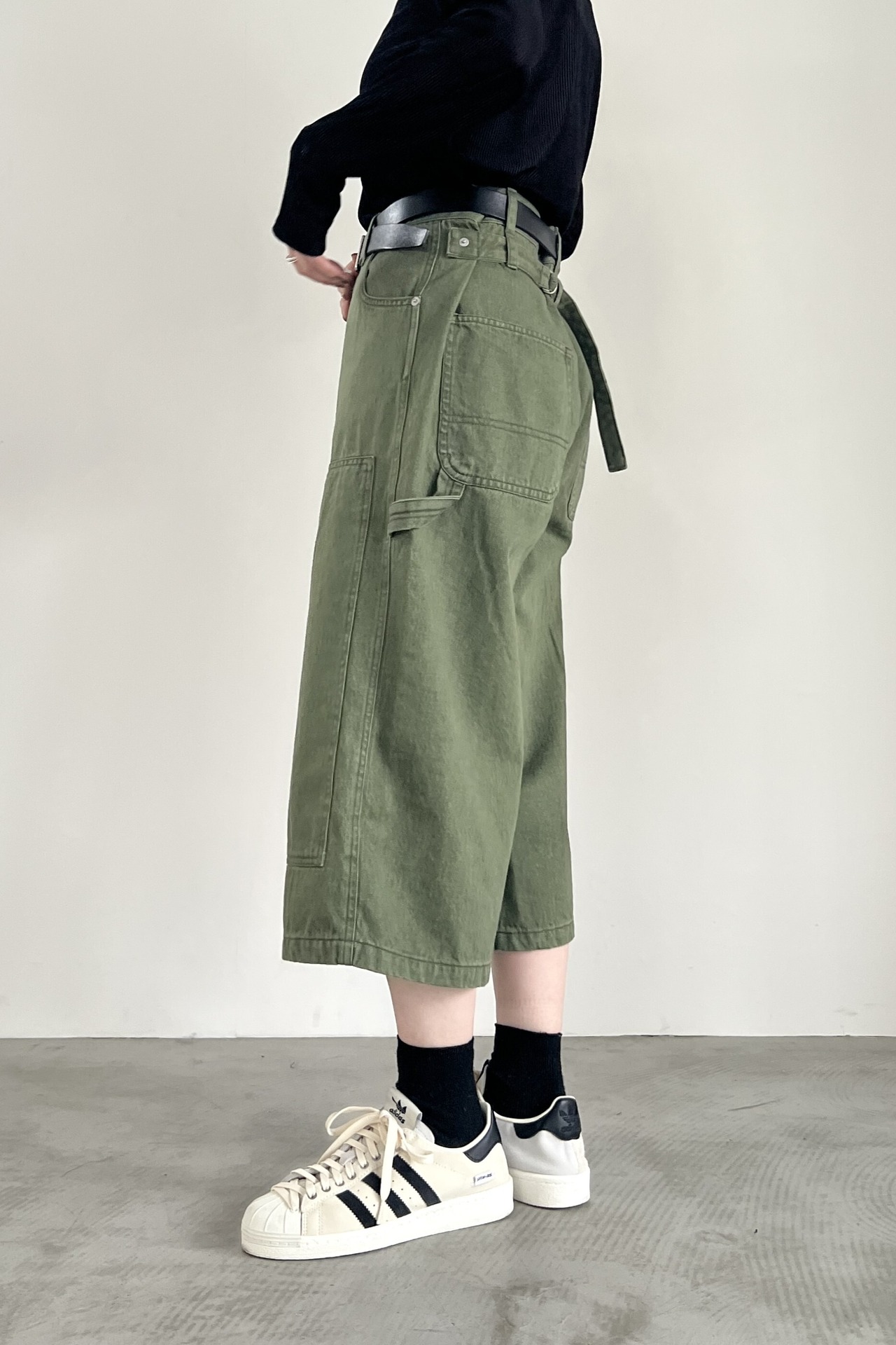 9.8オンスデニムを使用したトレンドのバミューダパンツ。ペインターパンツをベースに、大人が履ける丈感に落とし込みました。ジャケットやシャツ、ブーツなど綺麗めなアイテムと組み合わせることでエッジの効いたスタイリングを楽しめます。バックウエストを大きく作り、ベルトで締めて着用するデザインなので、幅広い方に着用いただけます。