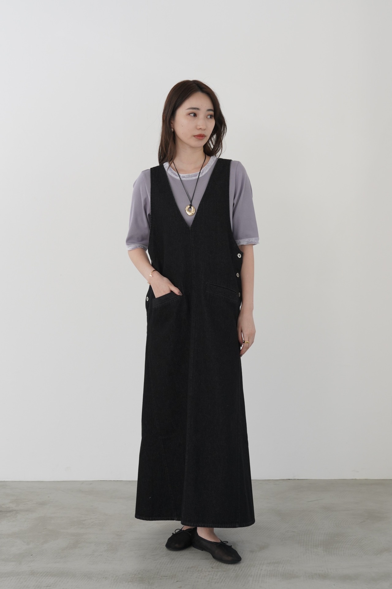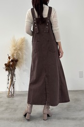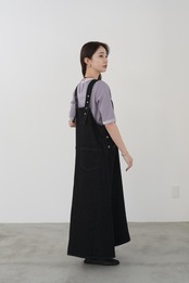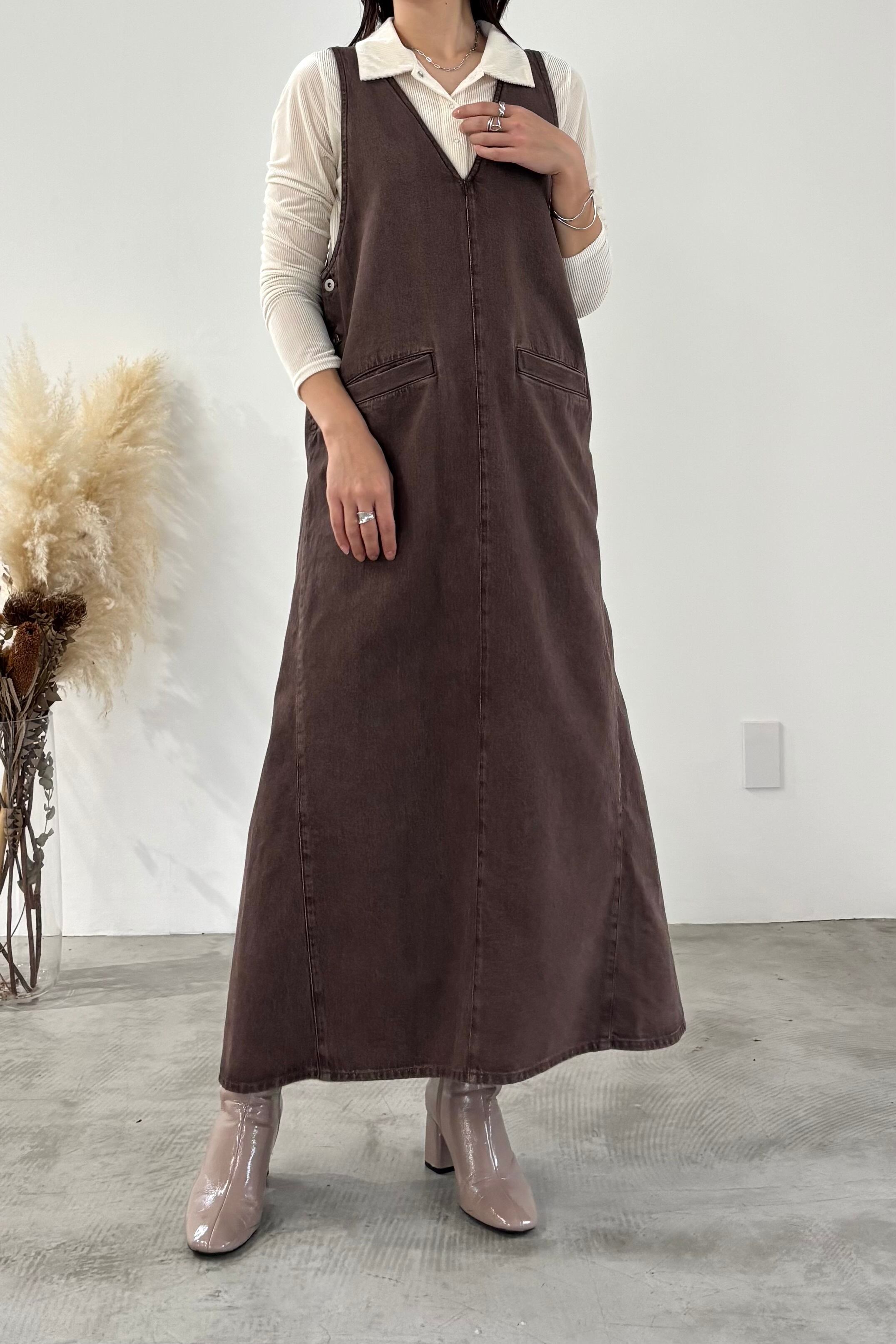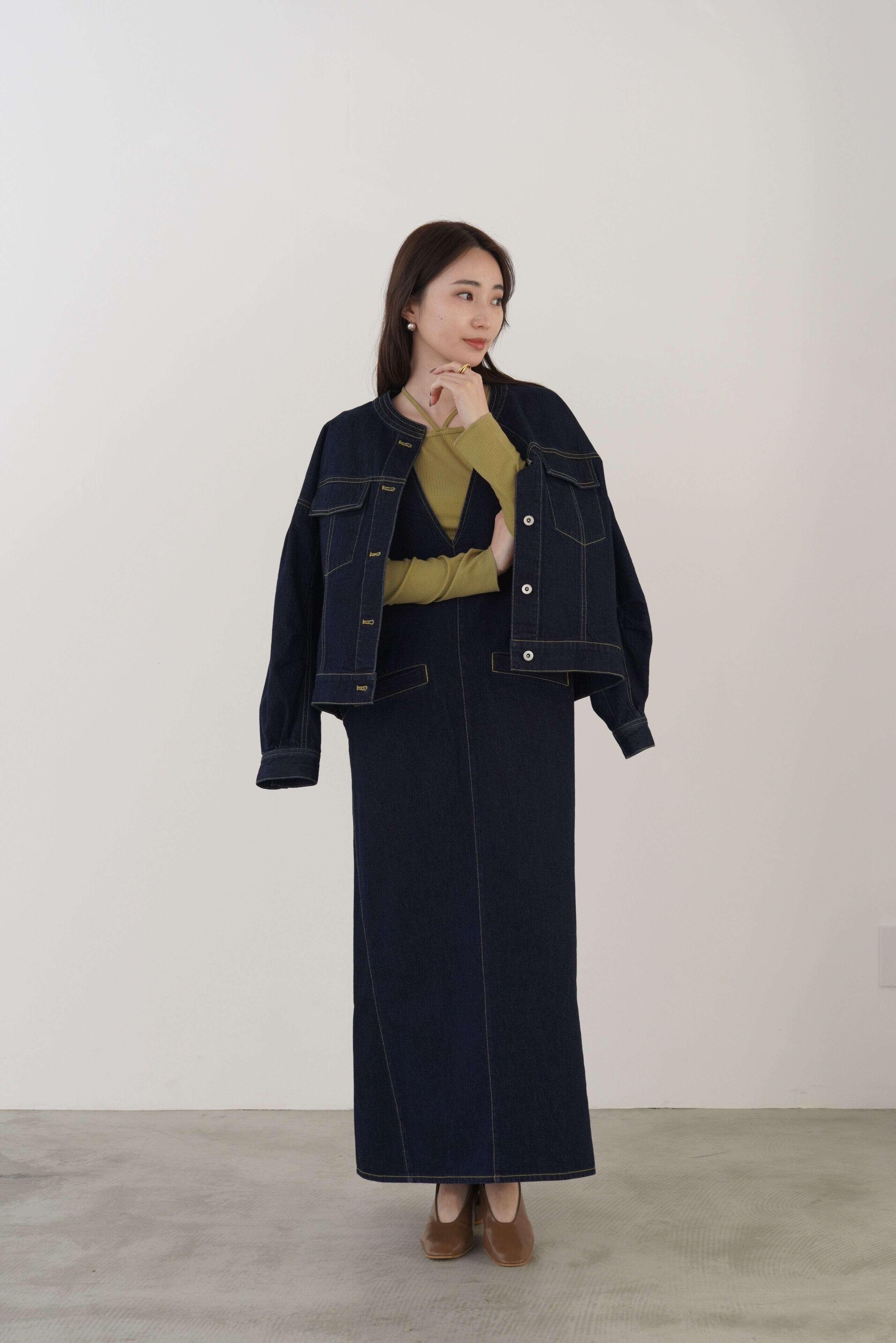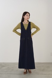 カジュアルに偏りがちなデニムジャンスカをすっきりVネック、フレアシルエットで女性らしく仕上げました。ベンツスリットで足捌きも抜群です。肩のストラップボタンで着用の調節が可能です。