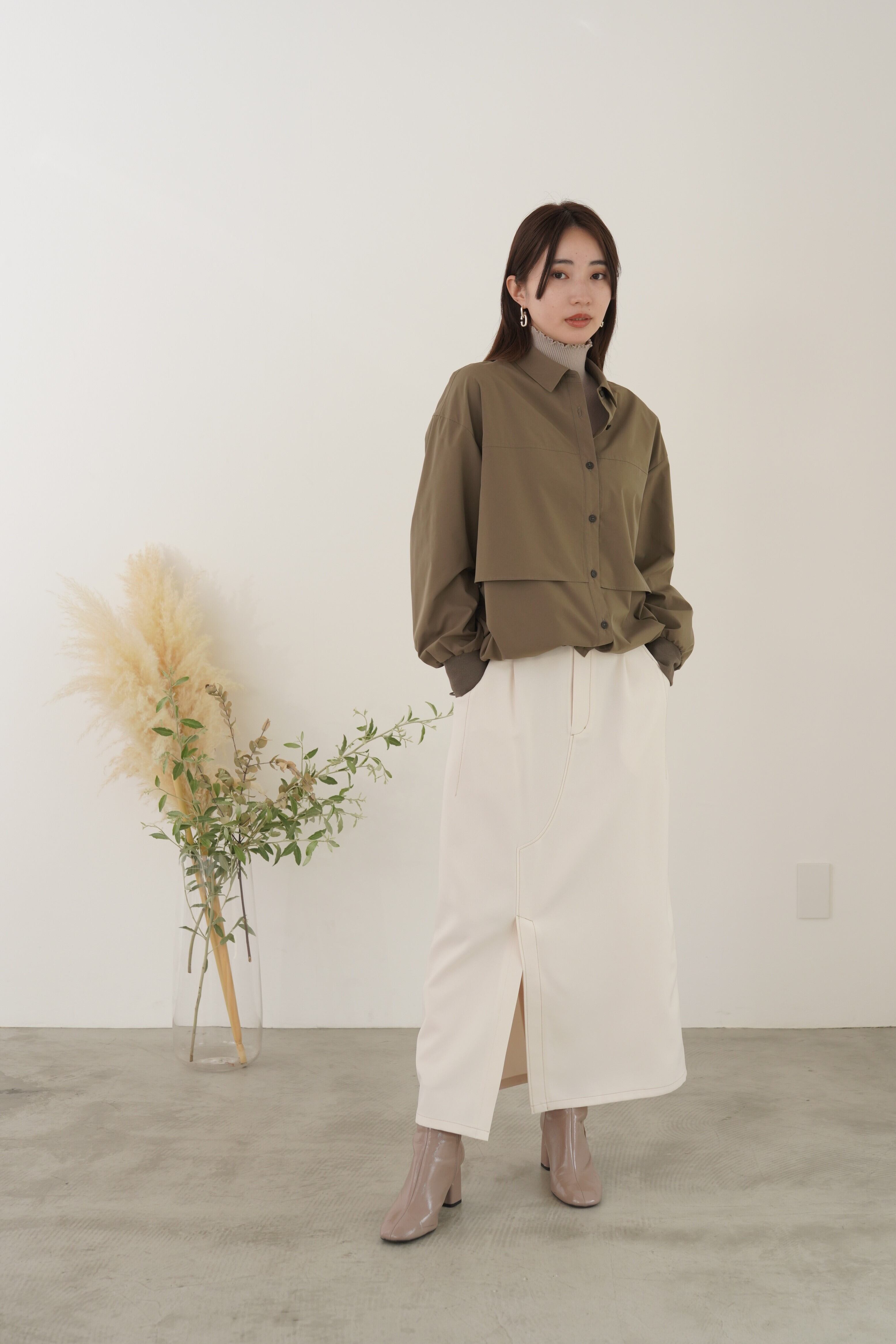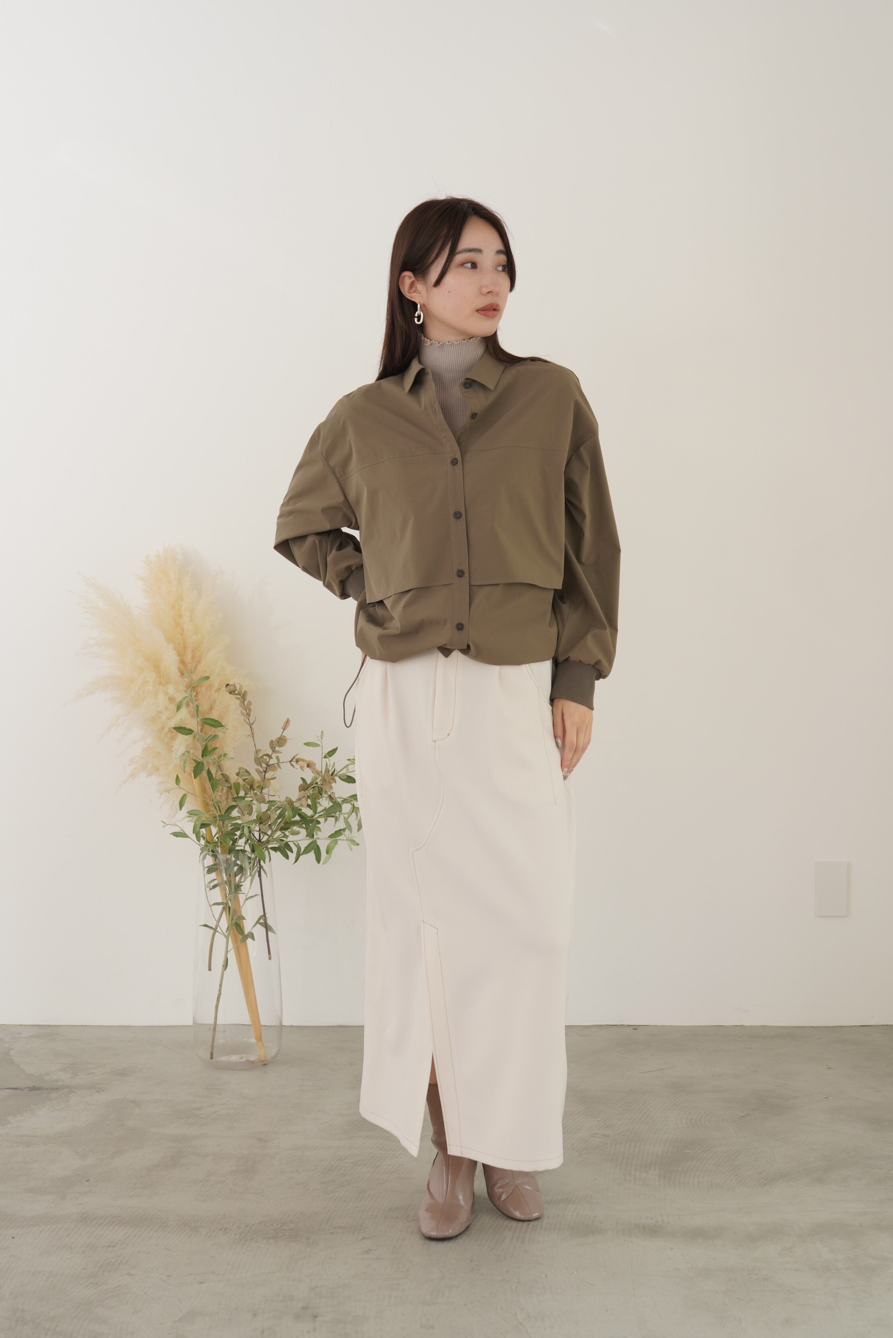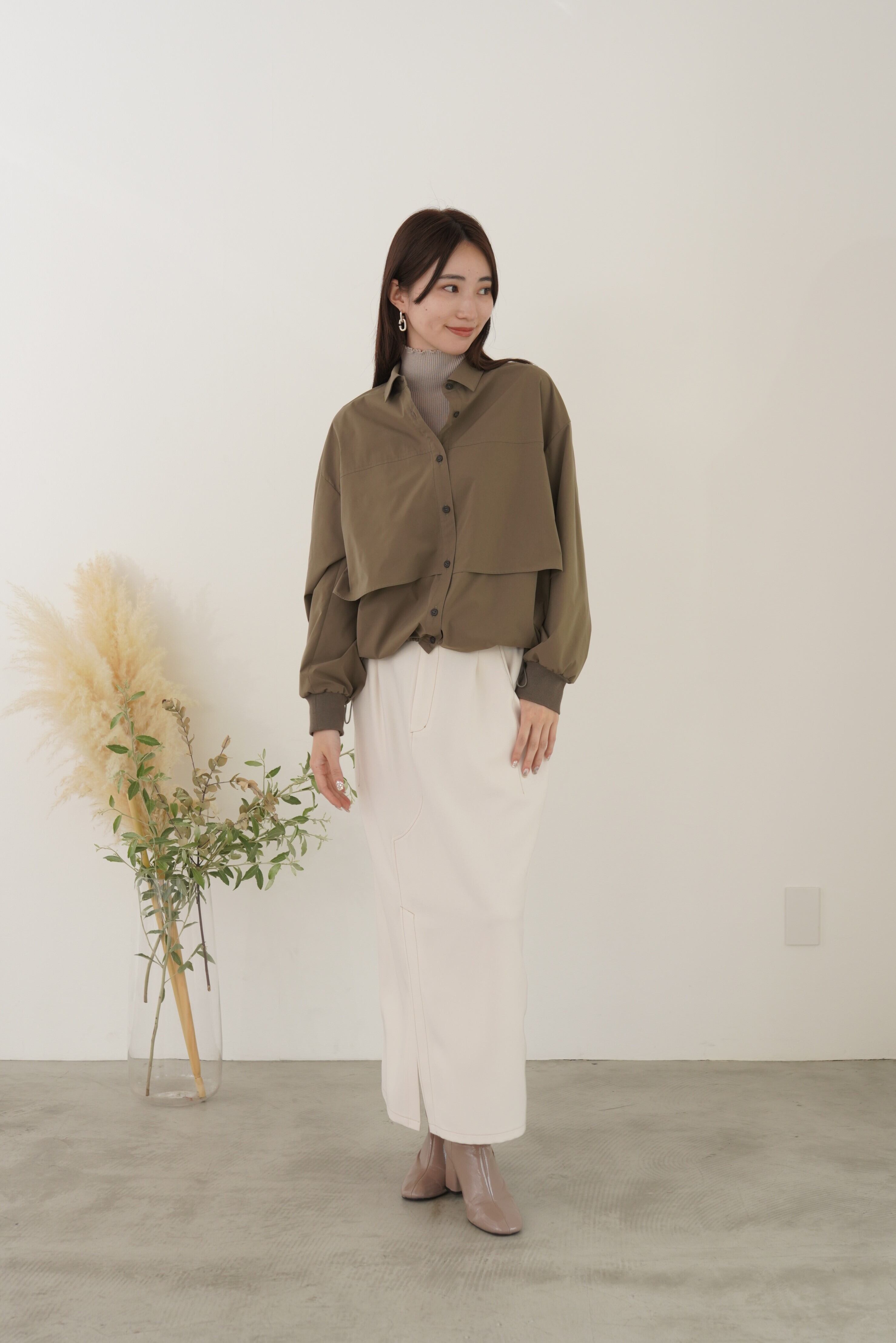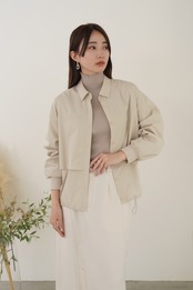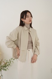 アイコンディテールのティアードシャツブルゾン。コットンライクの風合いのポリエステル素材でストレッチ性があり気楽に羽織れるややオーバーサイズに仕上げています。シーズンレスに長く活躍するライトブルゾンです。