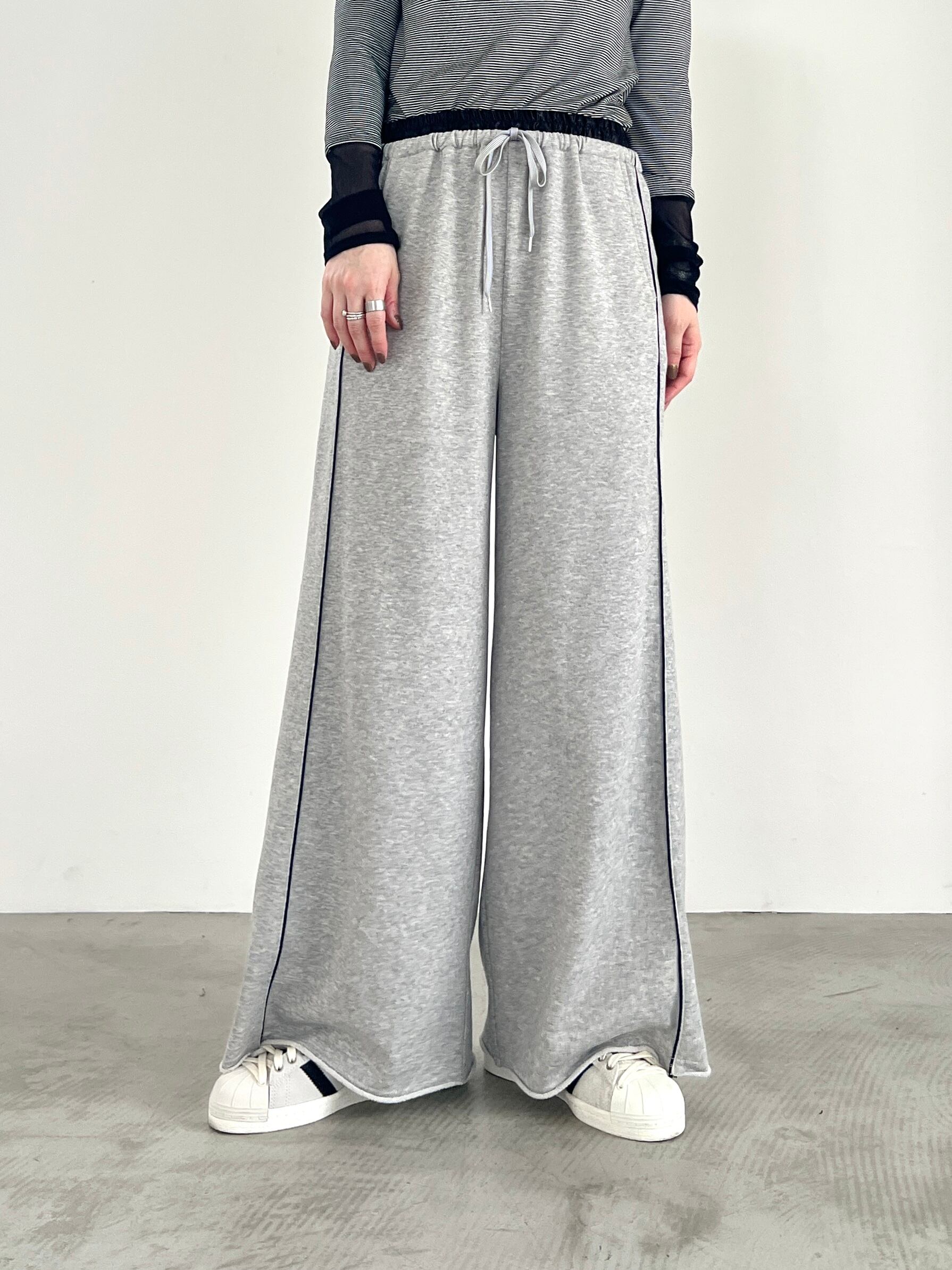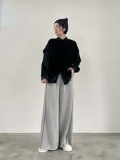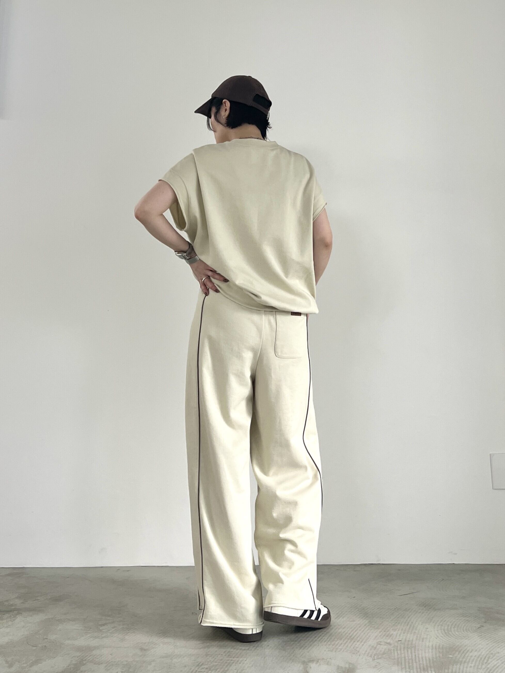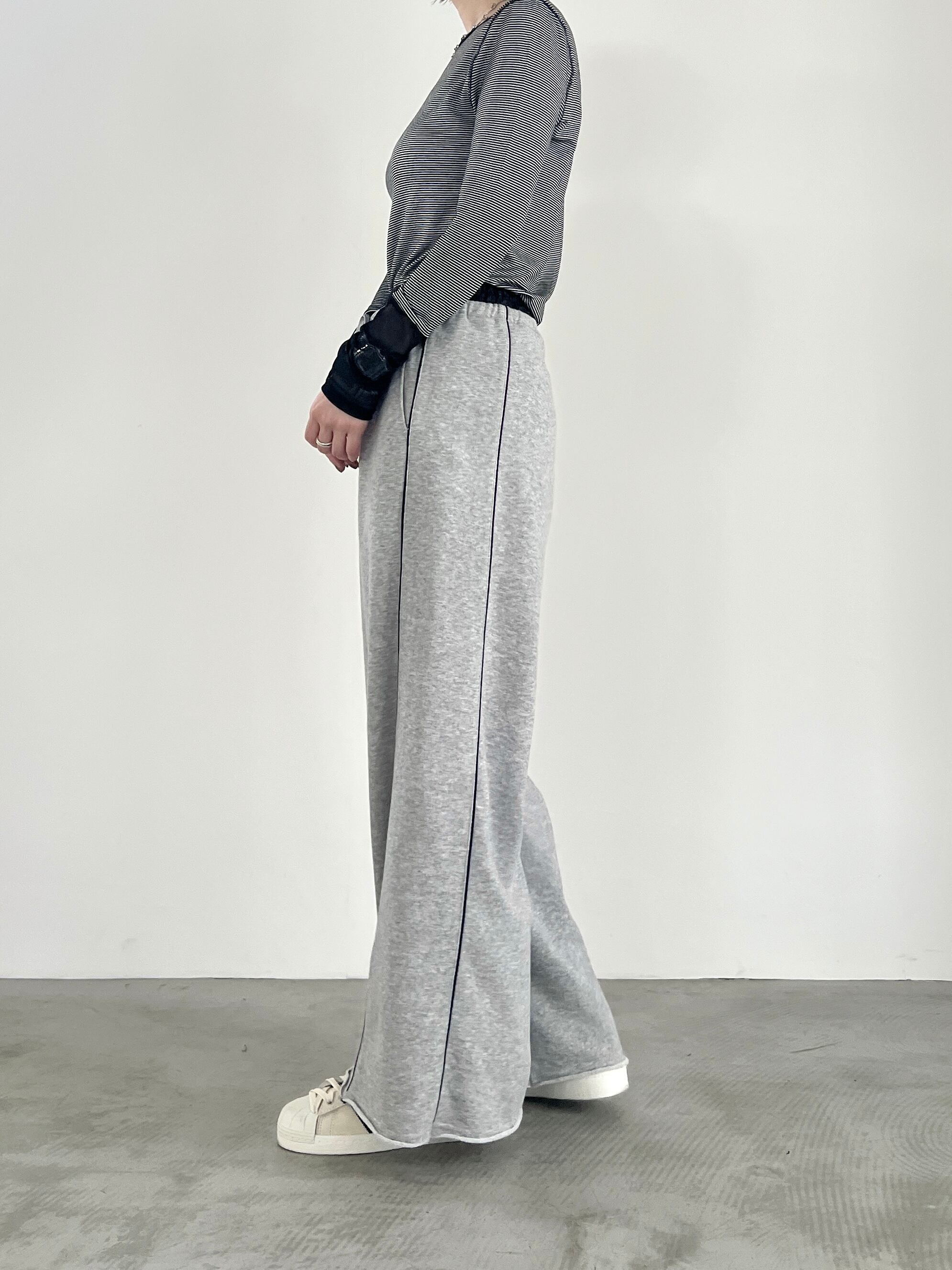 べーシックな国産ミニ裏毛を使用したワイドシルエットのスウェットパンツ。ウエストにレザー調素材を使用し、シーズンムードをプラス。細見え効果のある配色のパイピングライン、切りっぱなしの裾もポイント。同素材のプルオーバー、シャツとのセットアップもおすすめ。