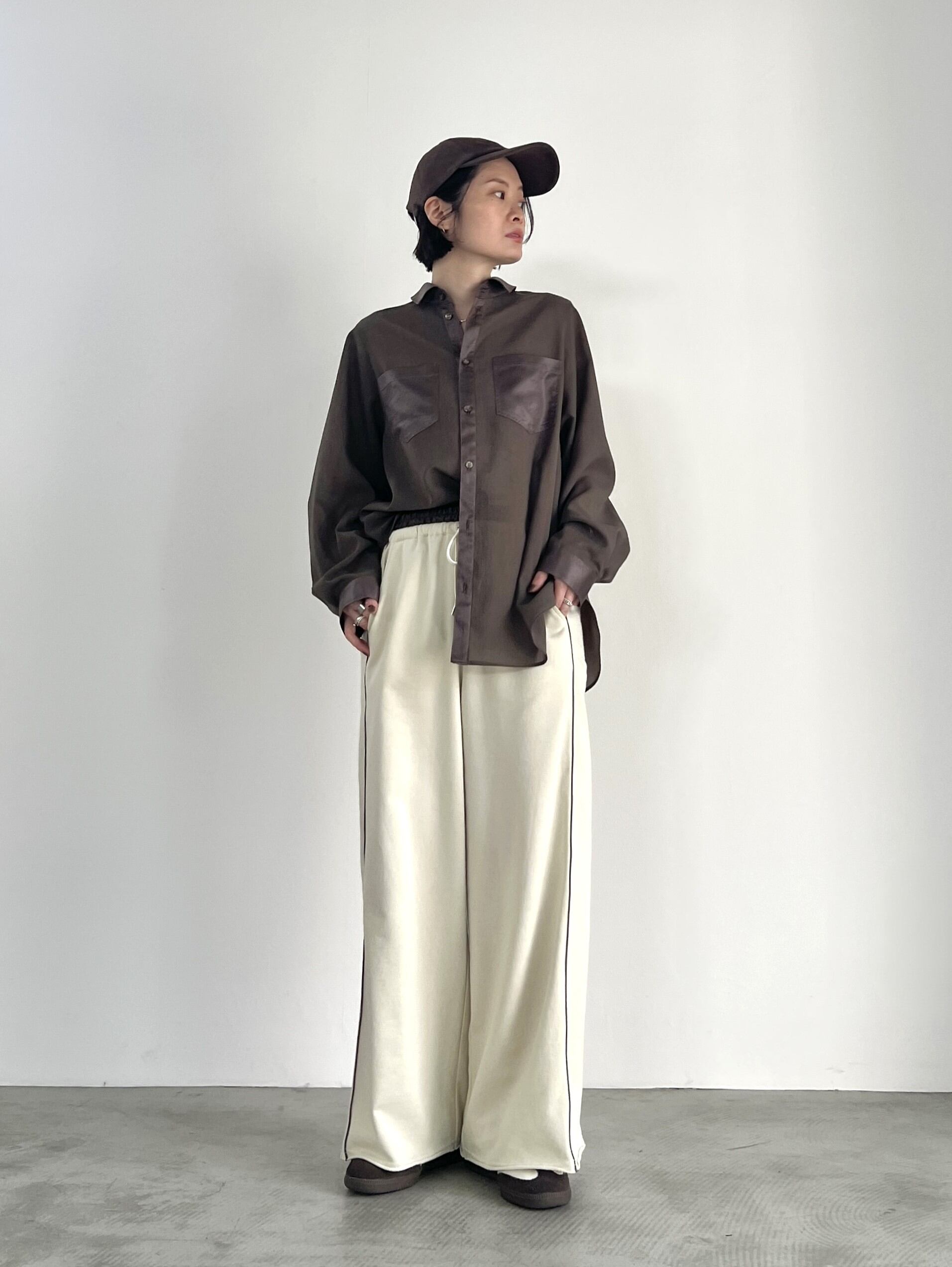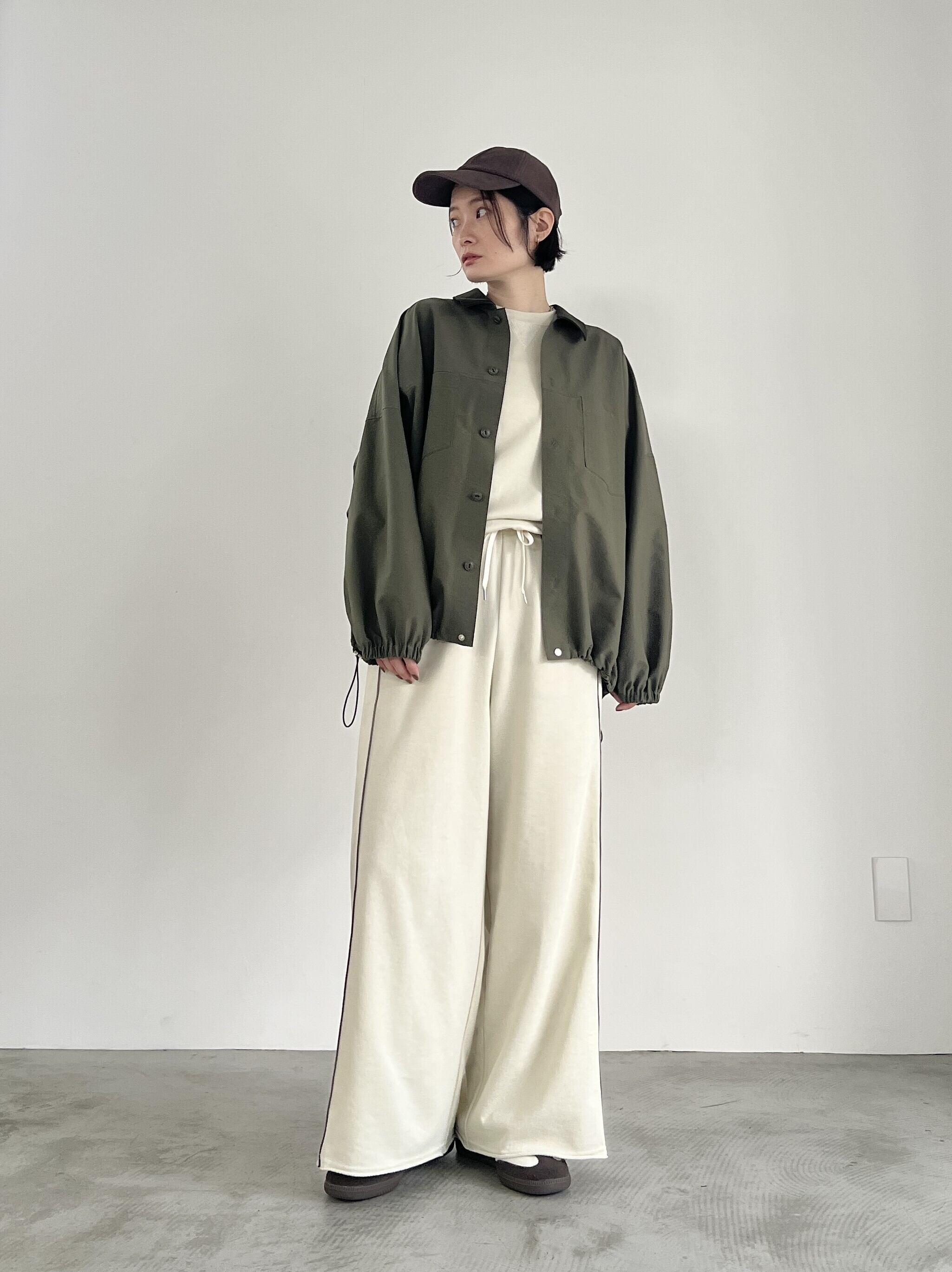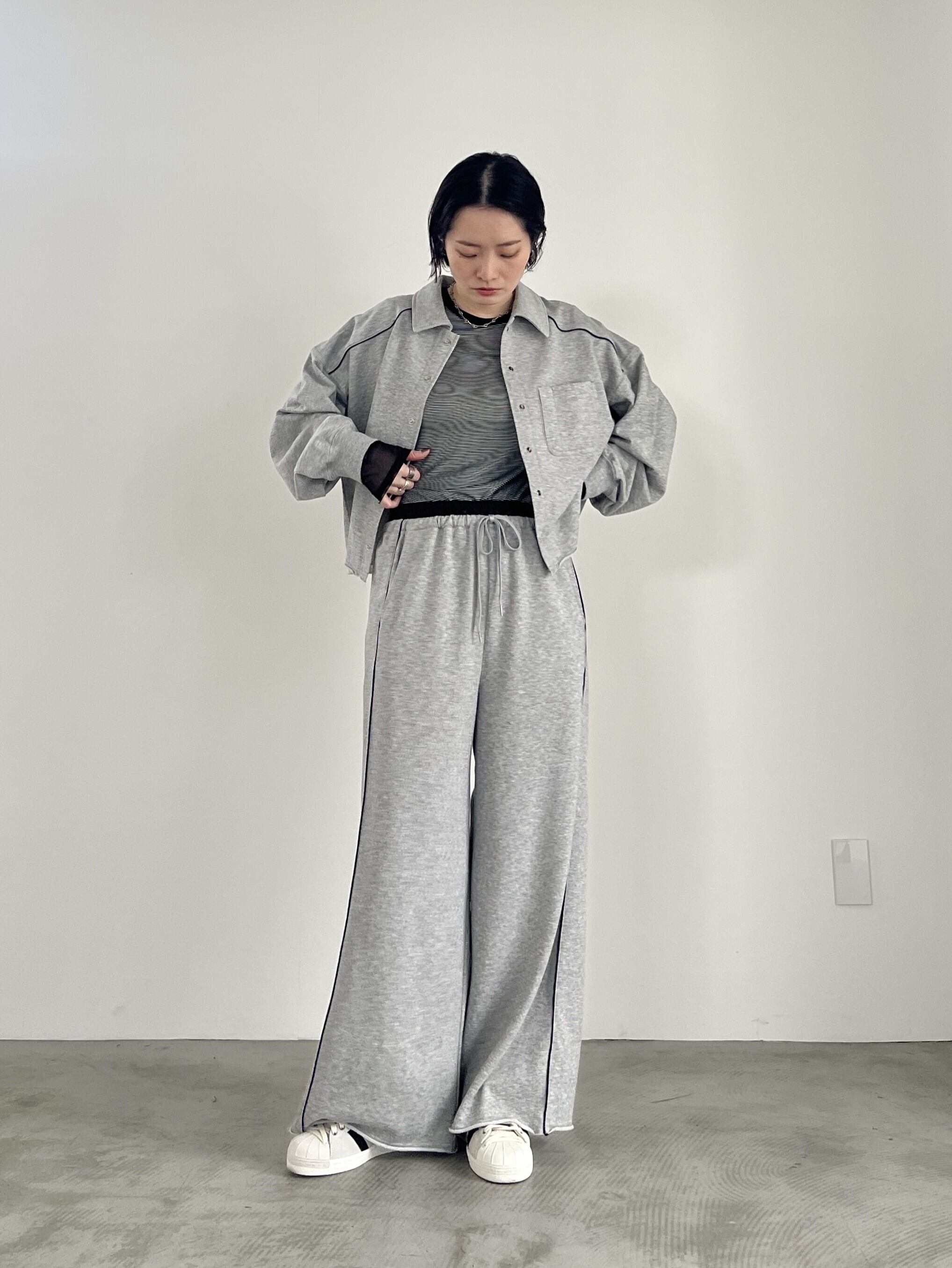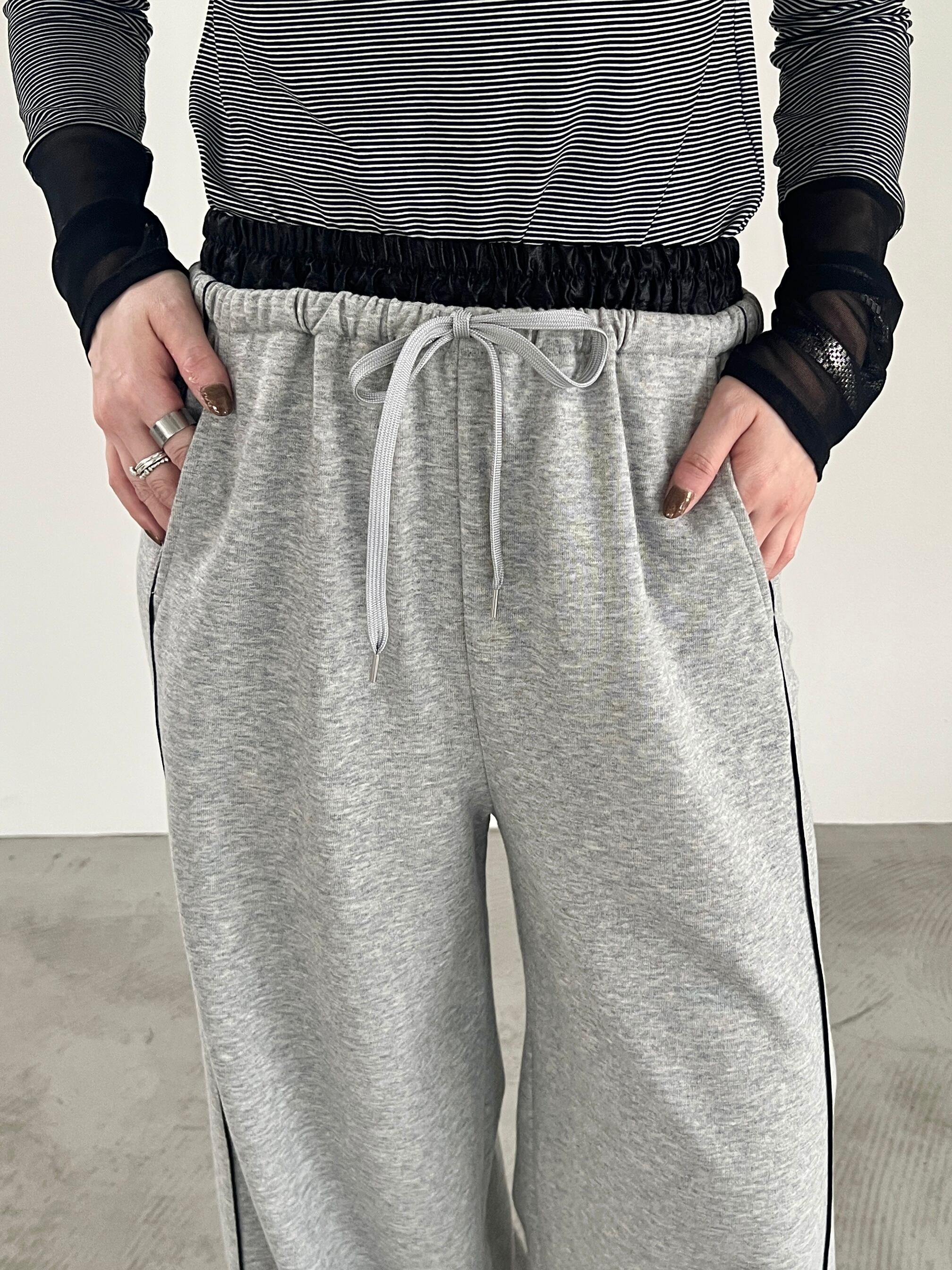 べーシックな国産ミニ裏毛を使用したワイドシルエットのスウェットパンツ。ウエストにレザー調素材を使用し、シーズンムードをプラス。細見え効果のある配色のパイピングライン、切りっぱなしの裾もポイント。同素材のプルオーバー、シャツとのセットアップもおすすめ。
