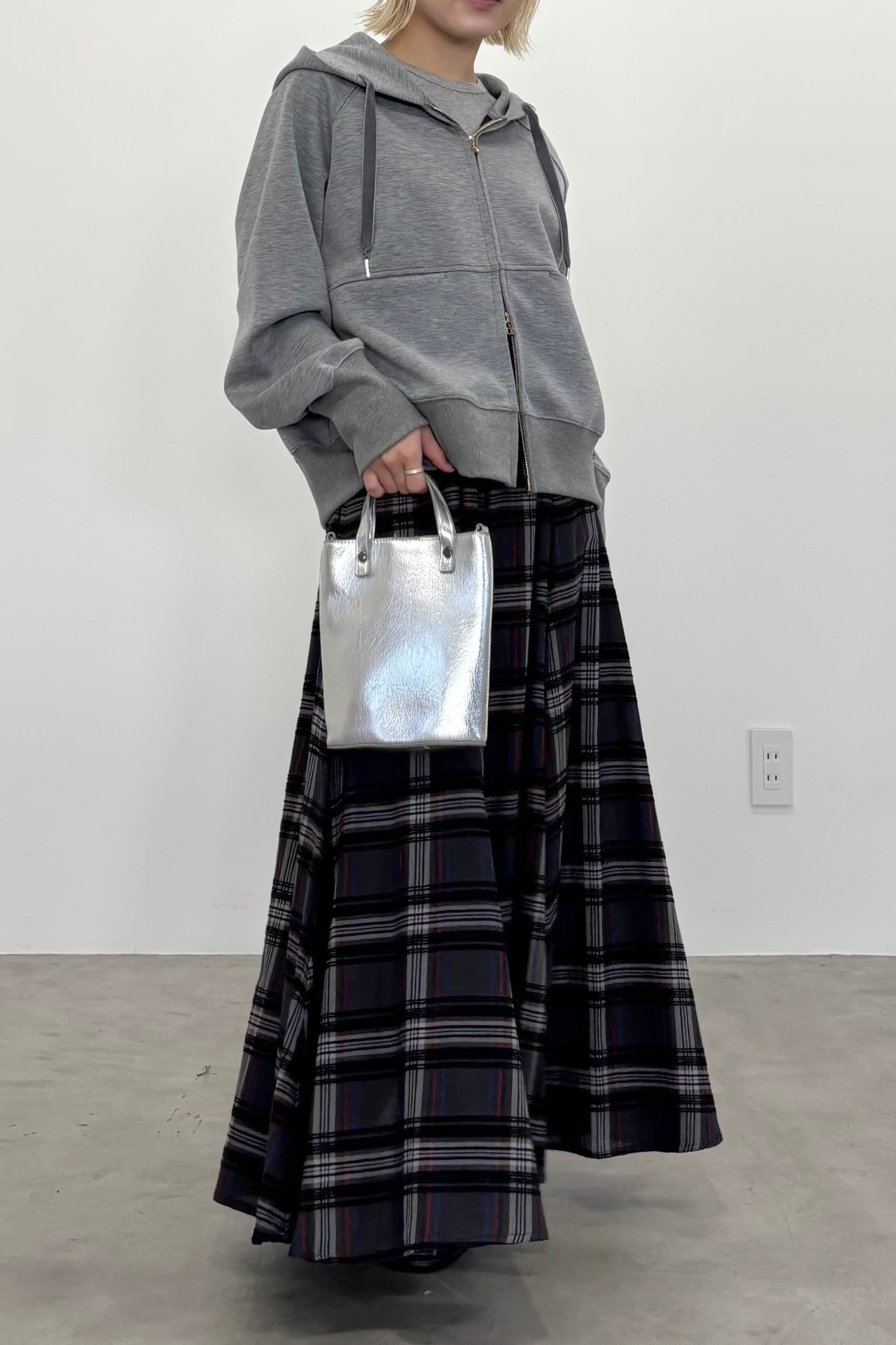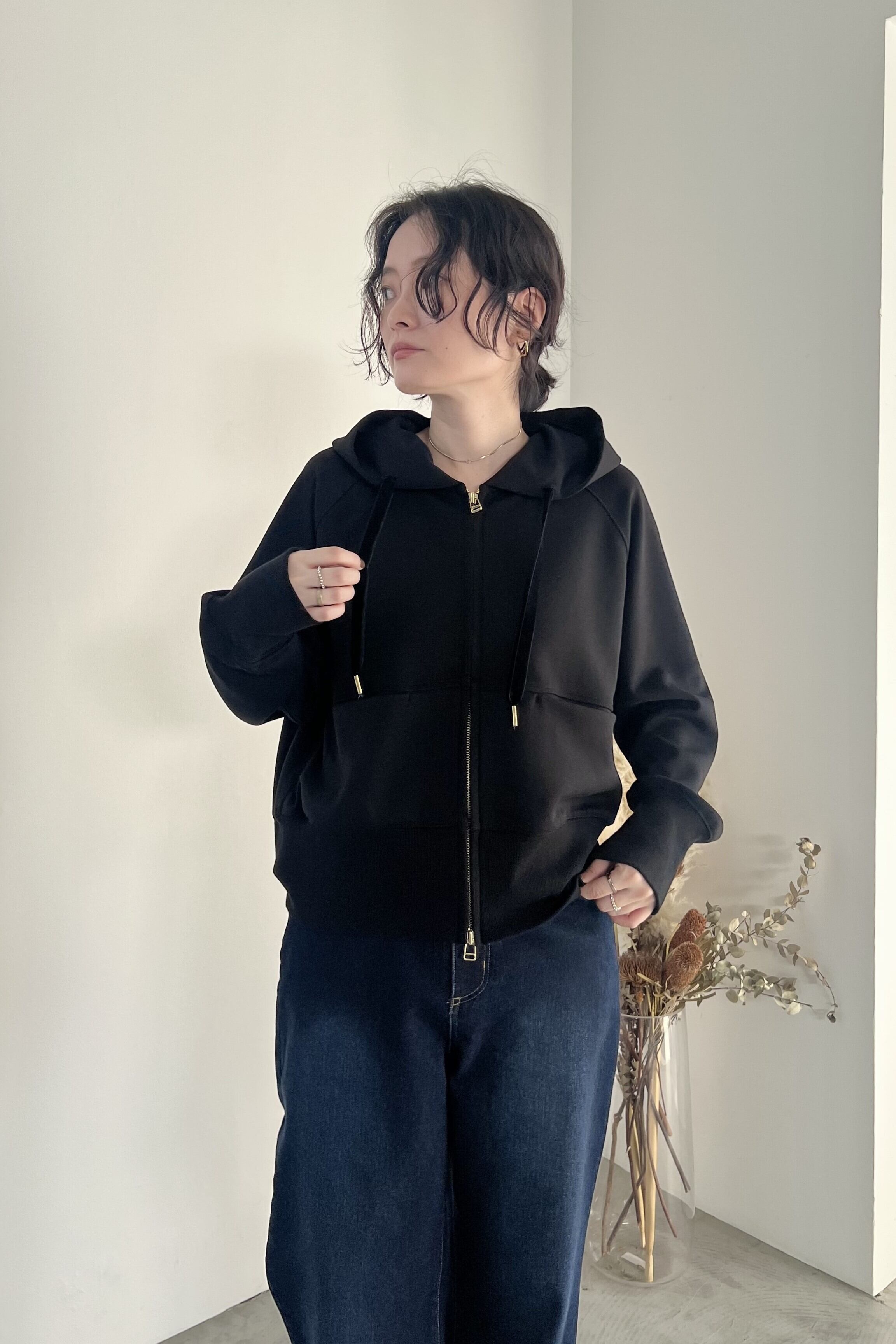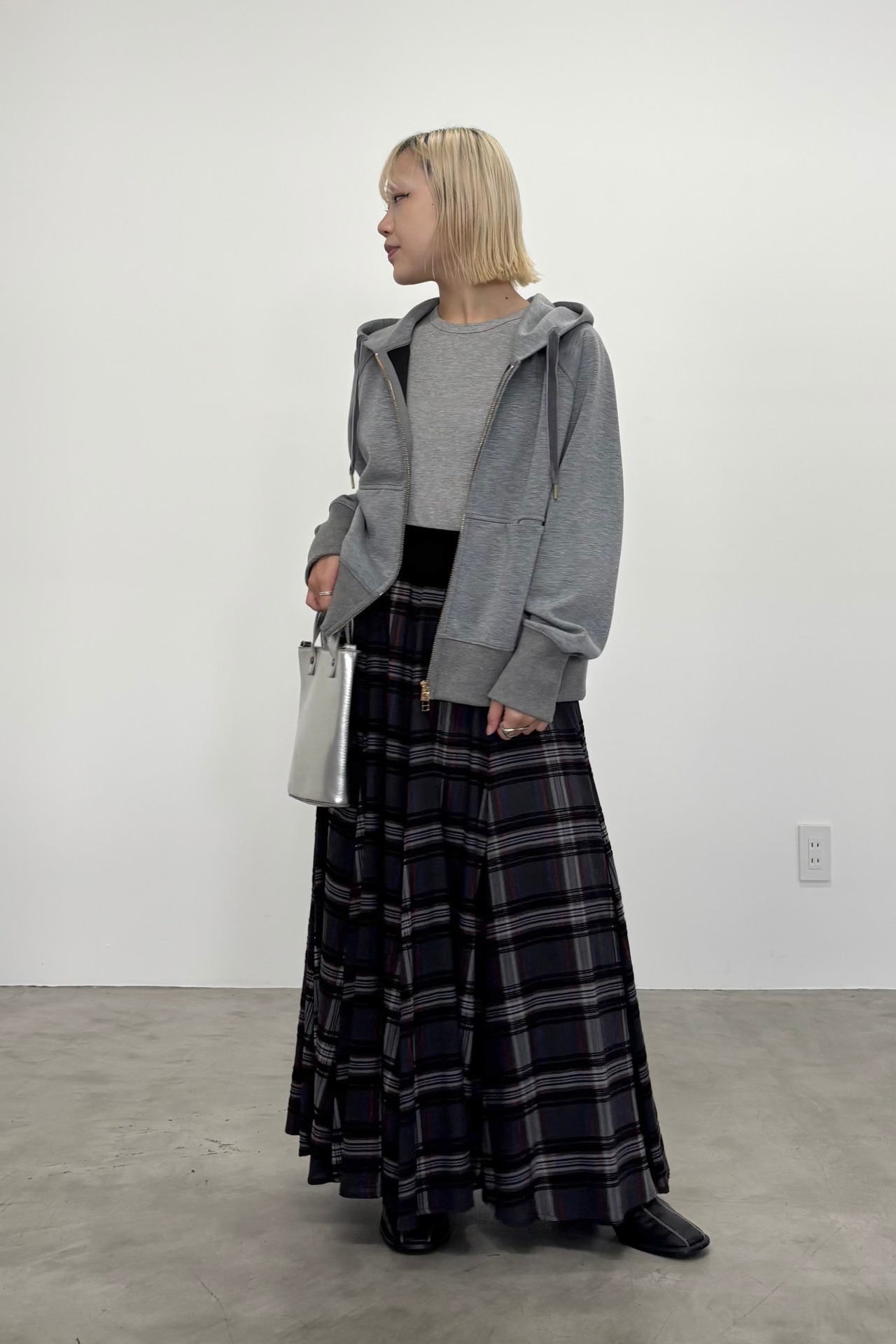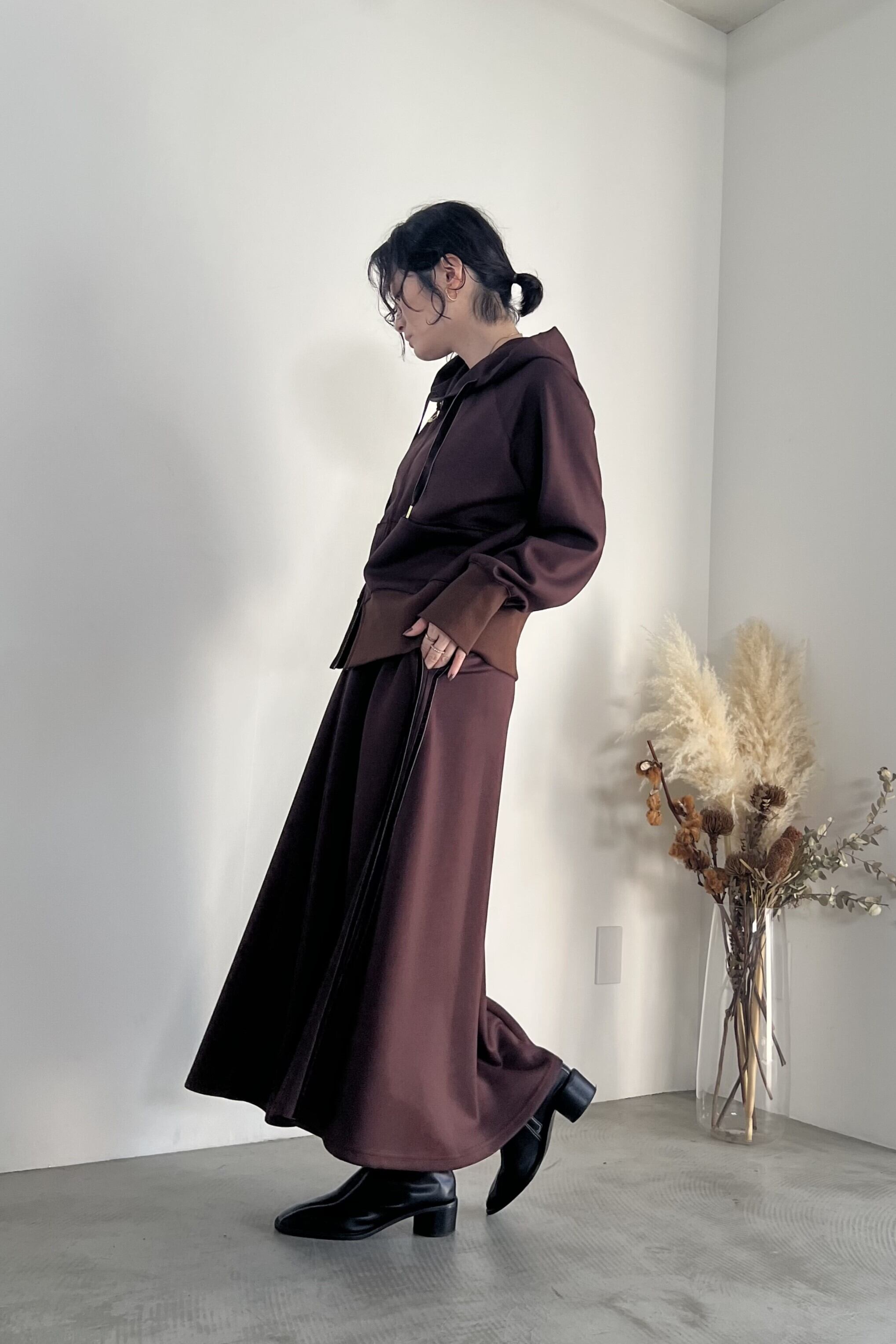 きれいな表面感とストレッチ性の高いダンボール素材を使用したジップパーカーです。気楽に羽織れるショート丈で、比較的コンパクトなサイズ感なので、上からコートなど羽織ってレイヤードスタイルを楽しむこともできます。同素材のフレアSKの展開もあります。
