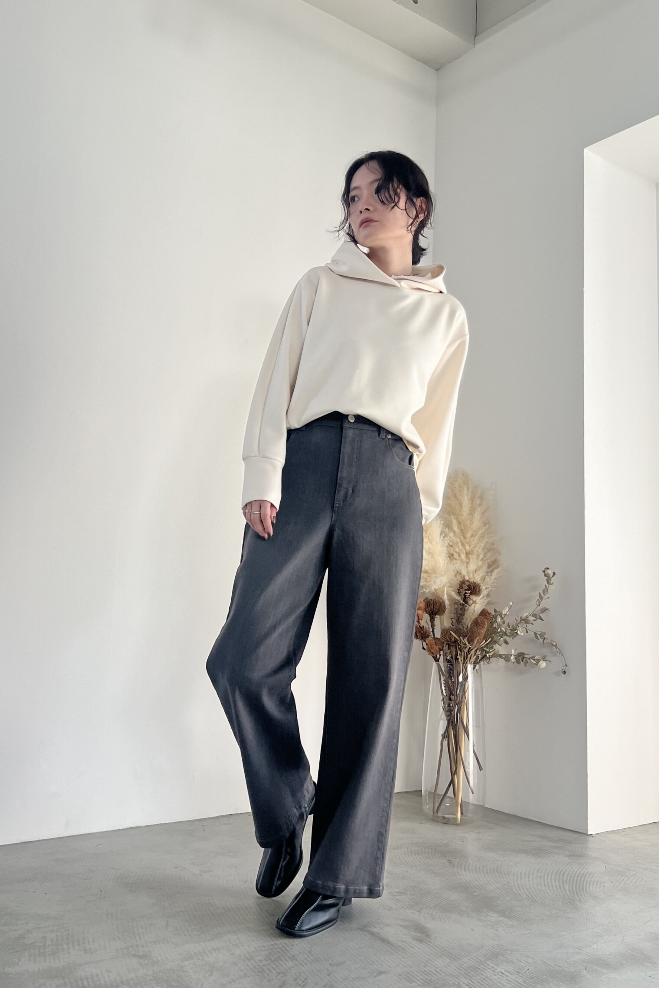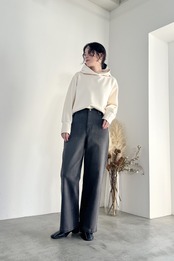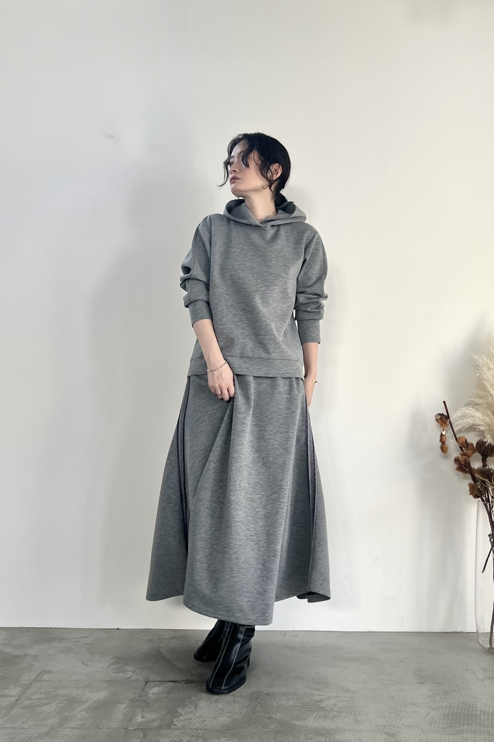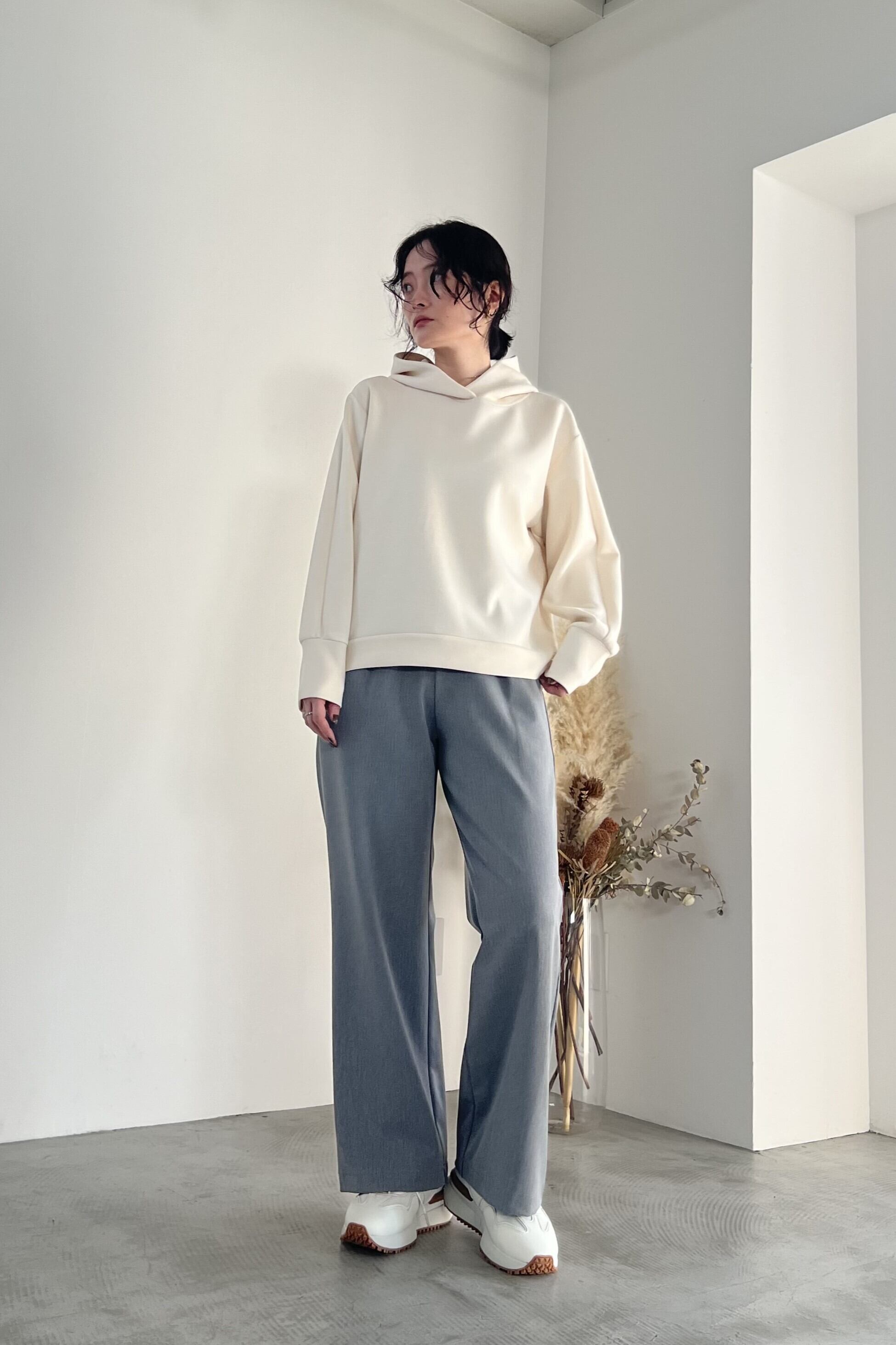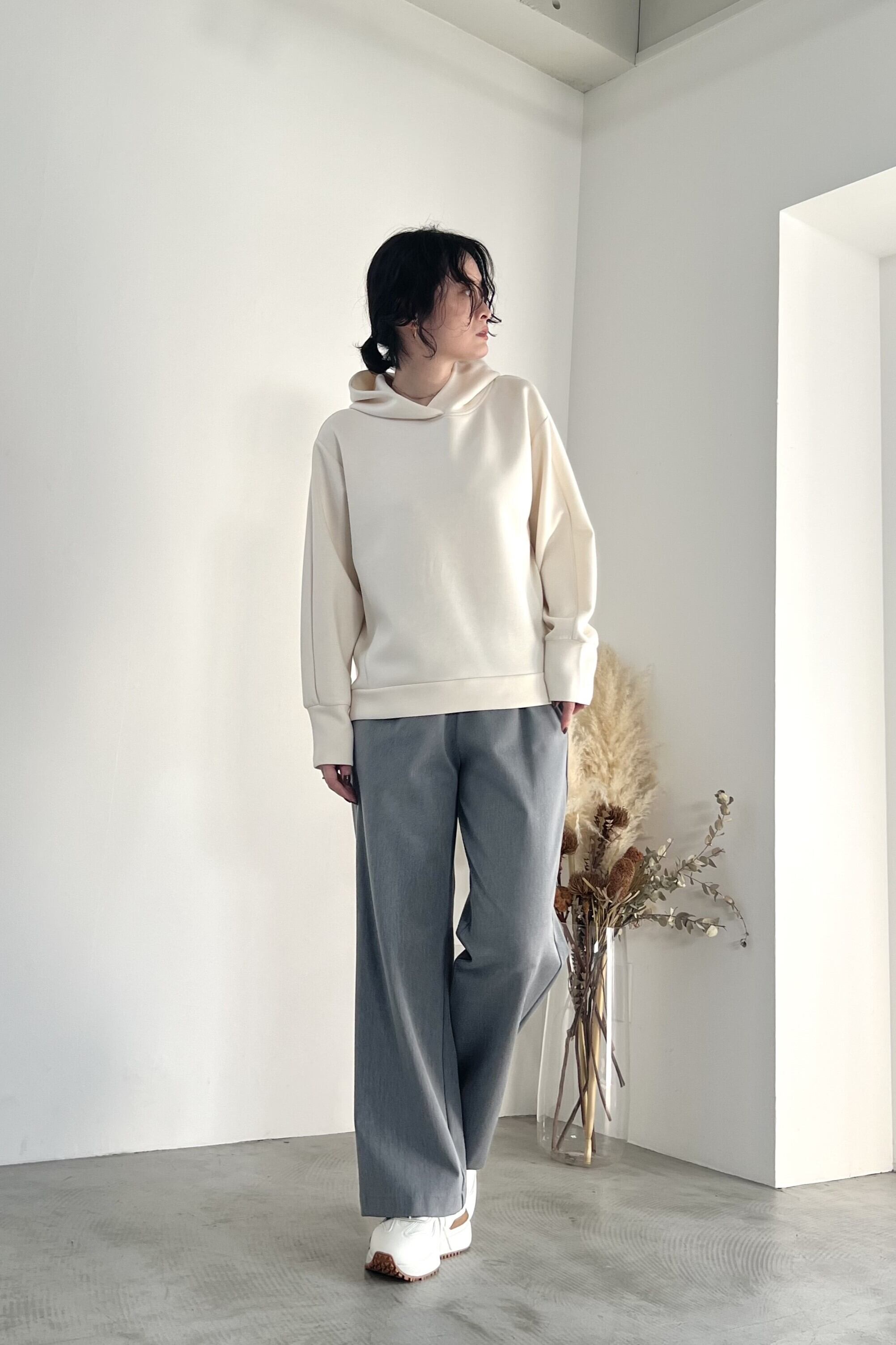 きれいな表面感とストレッチ性の高いダンボール素材を使用したフーディーです。あえてディテールをそぎ落とし、着回しやすさを重視しました。比較的コンパクトなサイズ感なので、アウターを選ばず着用していただけます。